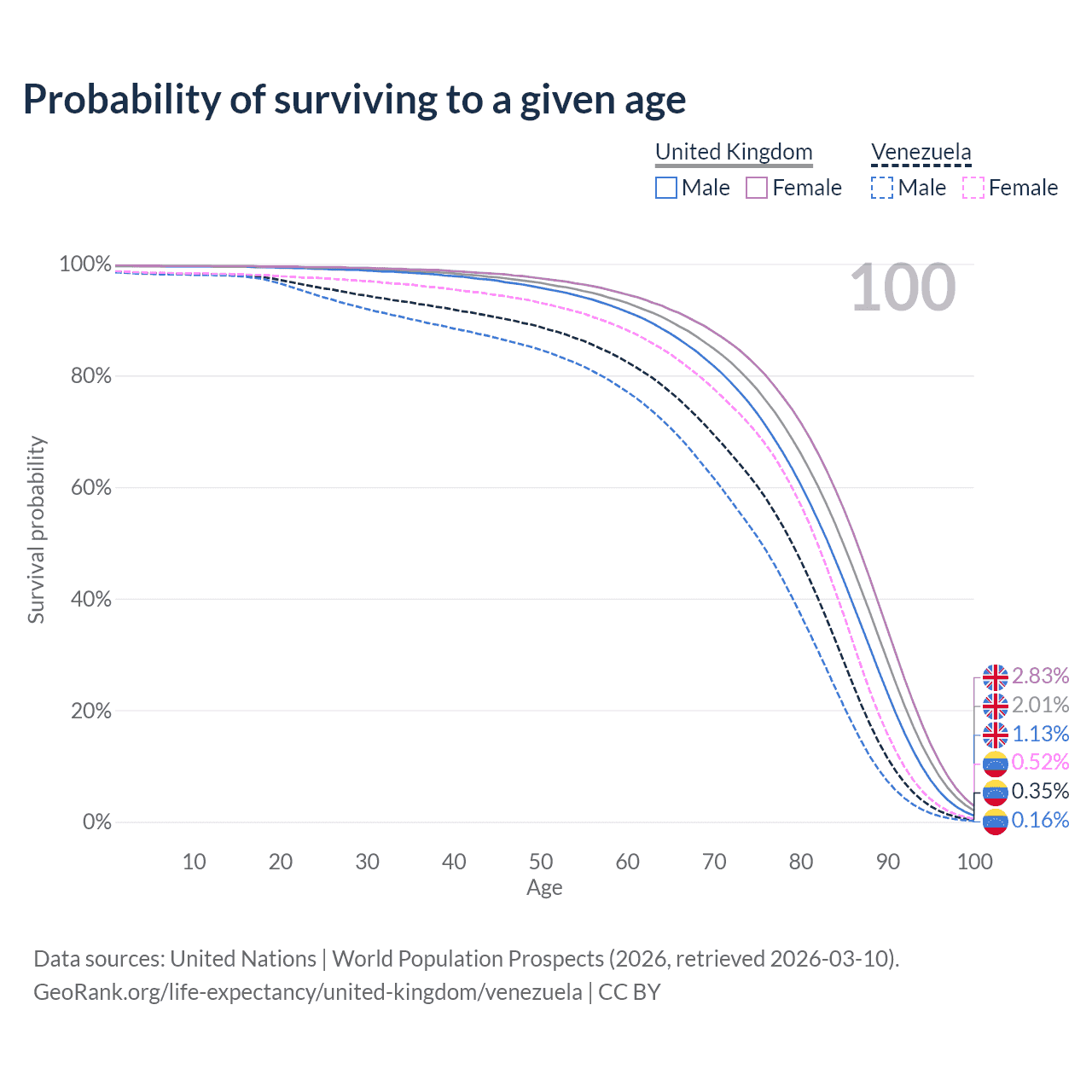 This life expectancy calculator shows the odds of living to 100, 95, 90, and below based on current age for both males and females in the United Kingdom and Venezuela, along with mean and median age of death. The calculations are based on the 2026 life tables (actuarial tables) from the UN World Population Prospects.