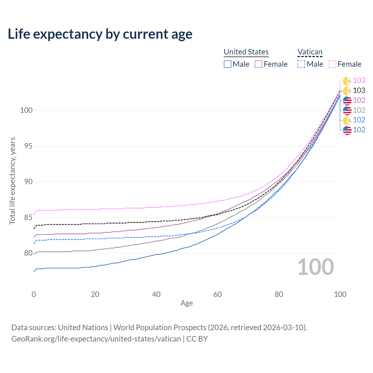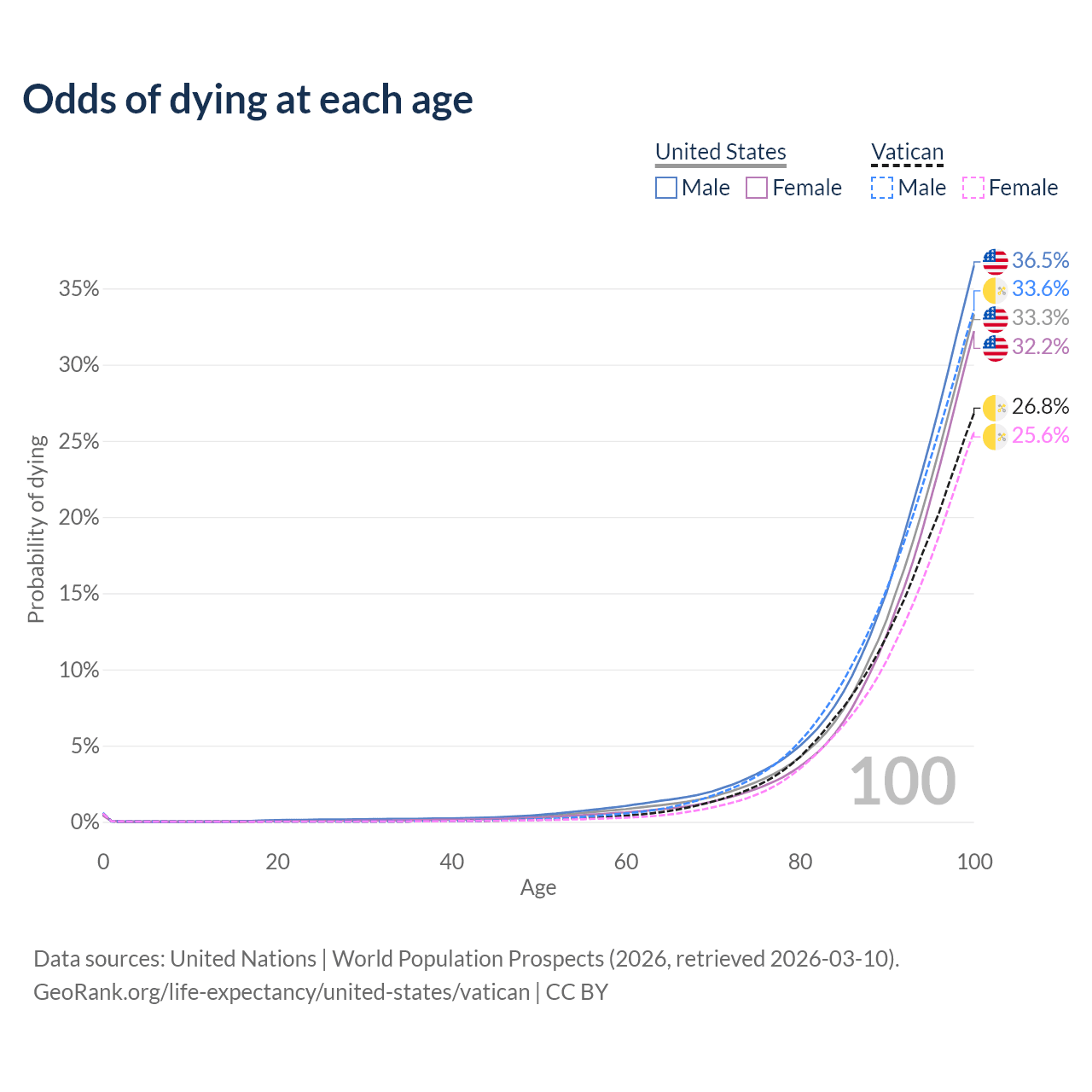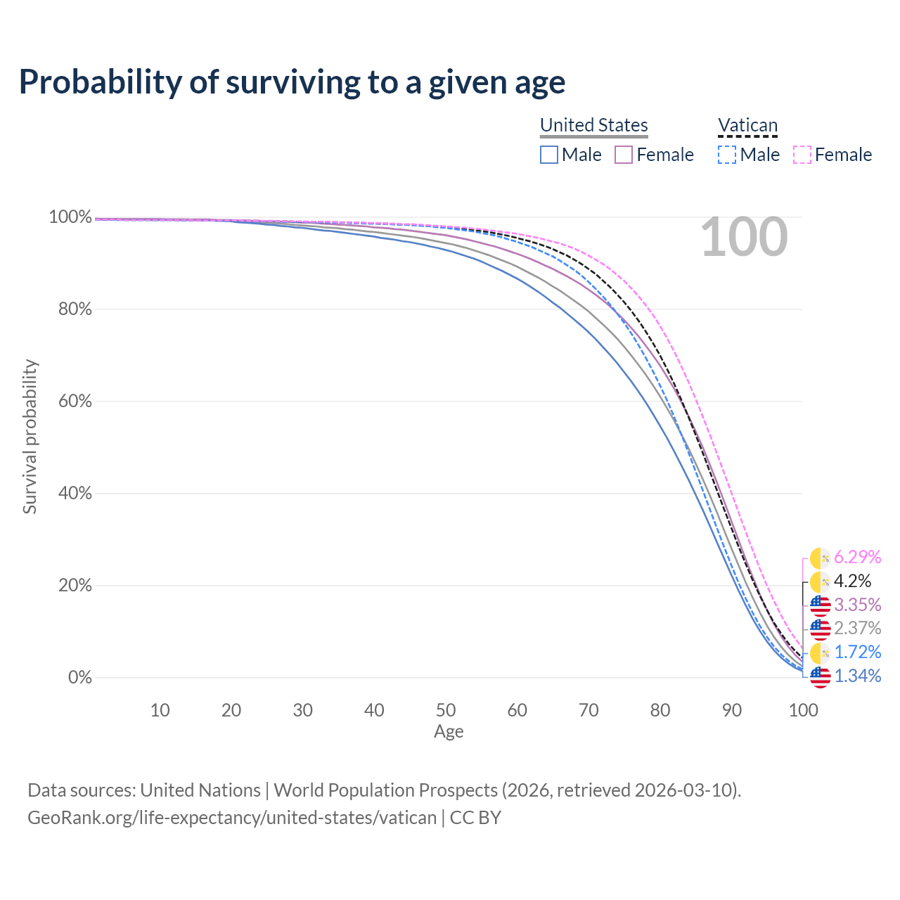 This life expectancy calculator shows the odds of living to 100, 95, 90, and below based on current age for both males and females in the United States and the Vatican, along with mean and median age of death. The calculations are based on the 2026 life tables (actuarial tables) from the UN World Population Prospects.
