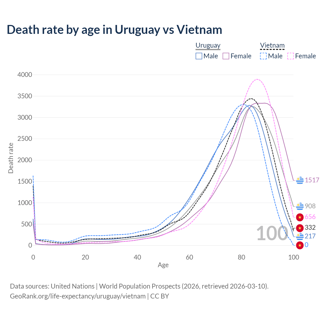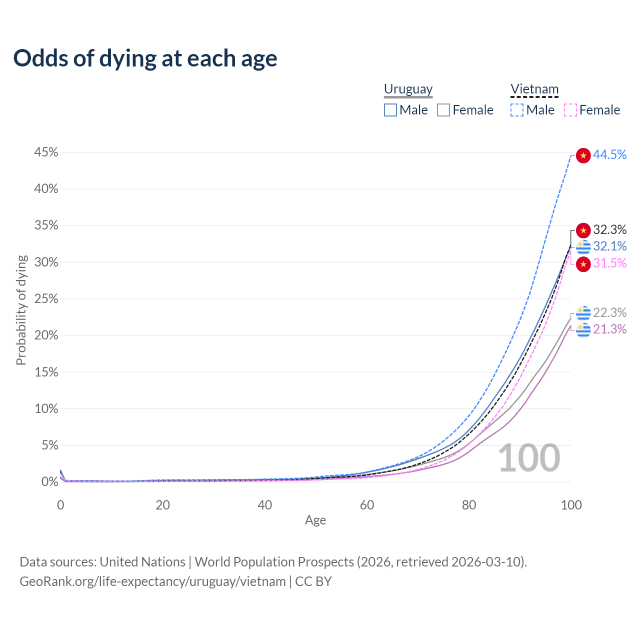 This life expectancy calculator shows the odds of living to 100, 95, 90, and below based on current age for both males and females in Uruguay and Vietnam, along with mean and median age of death. The calculations are based on the 2026 life tables (actuarial tables) from the UN World Population Prospects.
