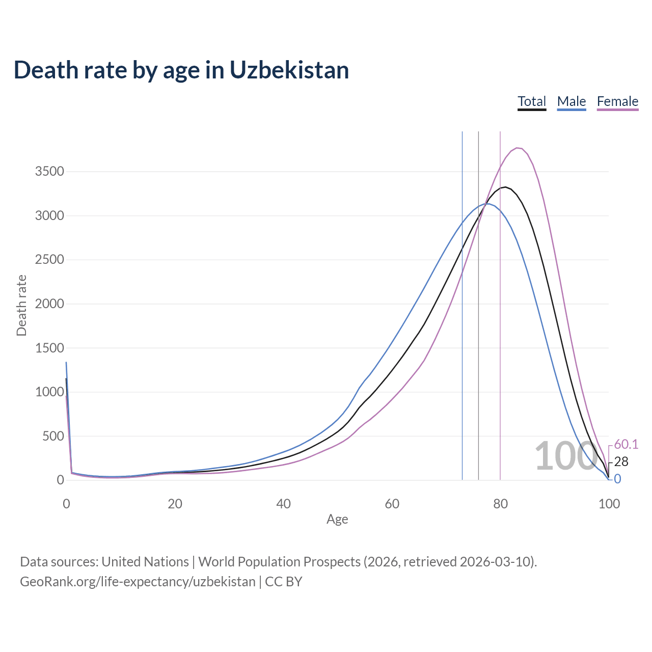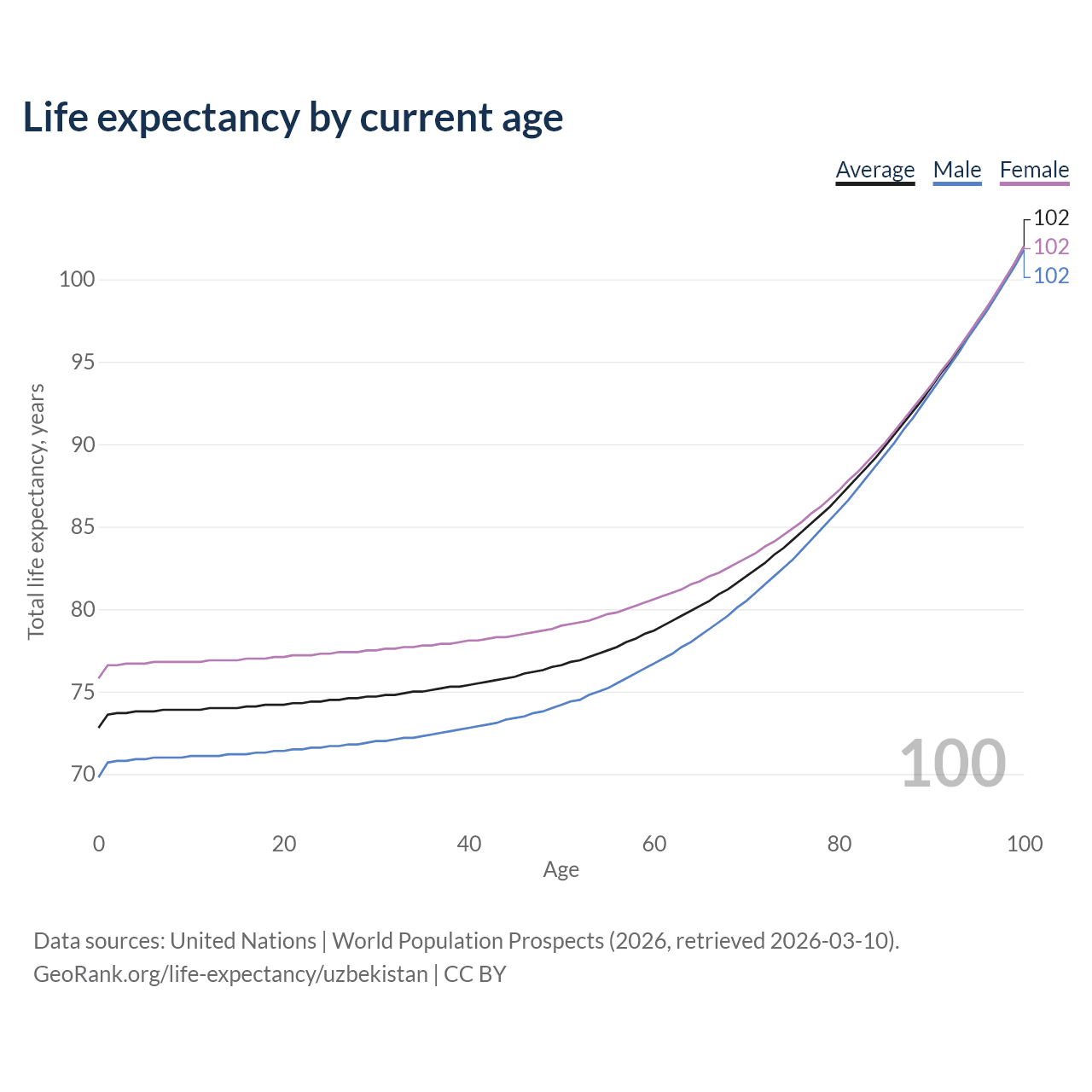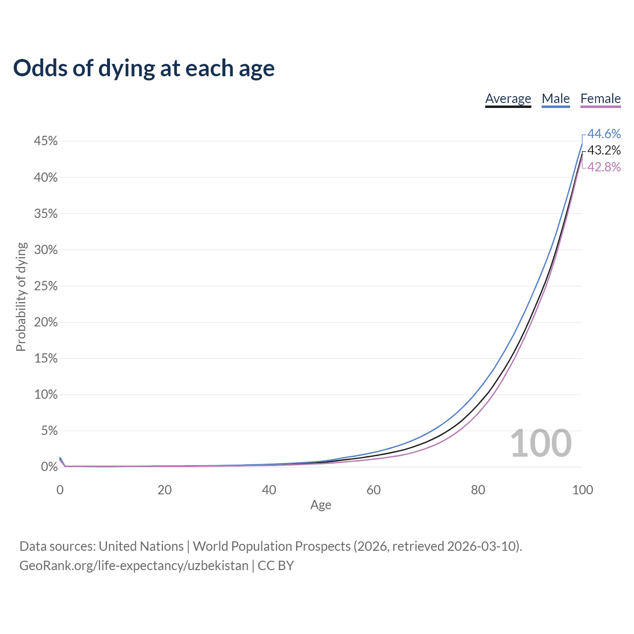 This life expectancy calculator shows the odds of living to 100, 95, 90, and below based on current age for both males and females in Uzbekistan, along with mean and median age of death. The calculations are based on the 2026 life tables (actuarial tables) from the UN World Population Prospects.