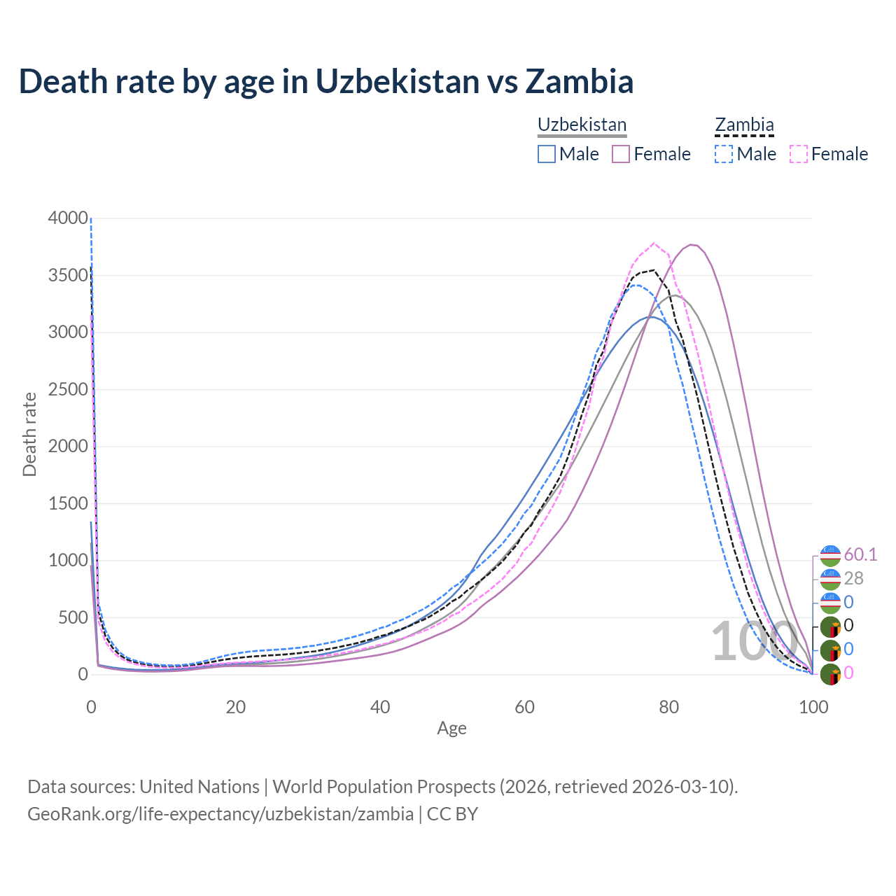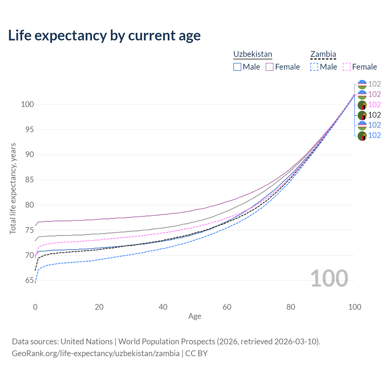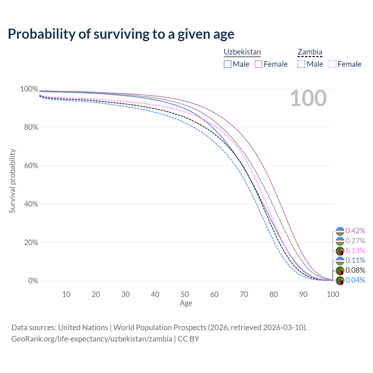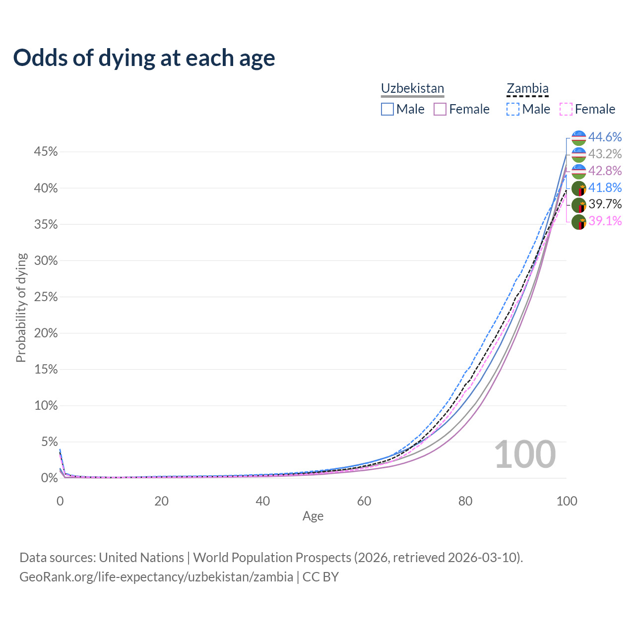This life expectancy calculator shows the odds of living to 100, 95, 90, and below based on current age for both males and females in Uzbekistan and Zambia, along with mean and median age of death. The calculations are based on the 2026 life tables (actuarial tables) from the UN World Population Prospects.
