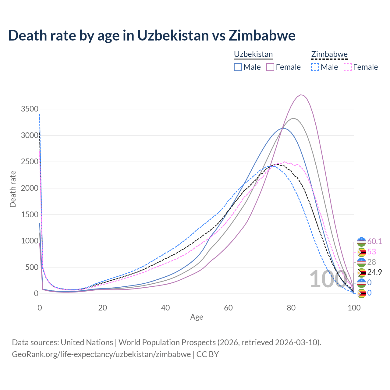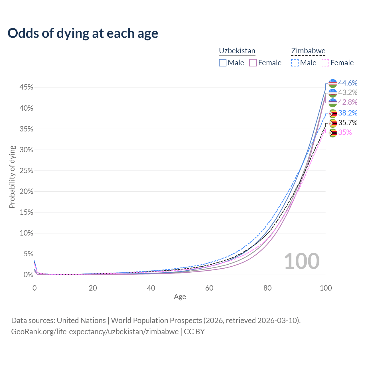This life expectancy calculator shows the odds of living to 100, 95, 90, and below based on current age for both males and females in Uzbekistan and Zimbabwe, along with mean and median age of death. The calculations are based on the 2026 life tables (actuarial tables) from the UN World Population Prospects.