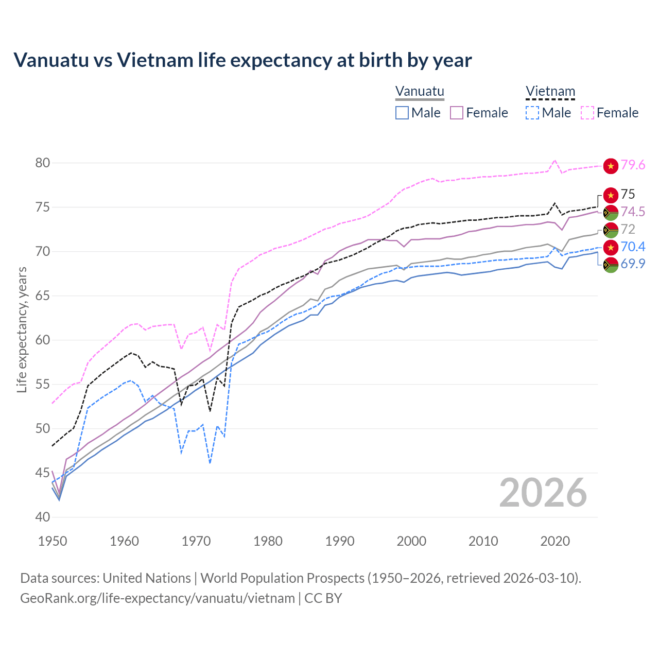 The average life expectancy at birth is 72 years in Vanuatu vs 75 in Vietnam. Vanuatu is ranked 125/197 by life expectancy, and Vietnam is 93/197. In Vanuatu, the life expectancy is 69.9 years for males and 74.5 years for females. In Vietnam, it's 70.4 years for males and 79.6 years for females.