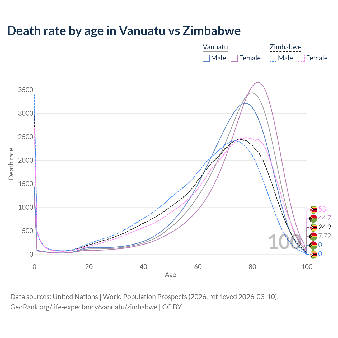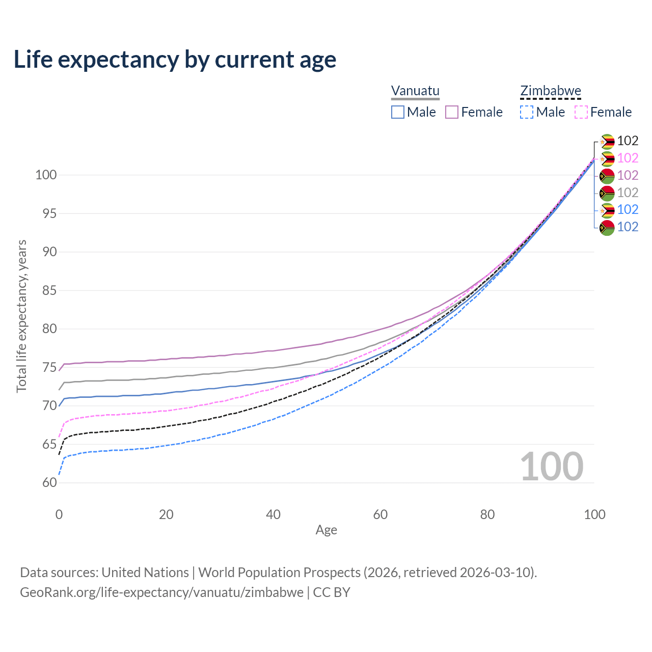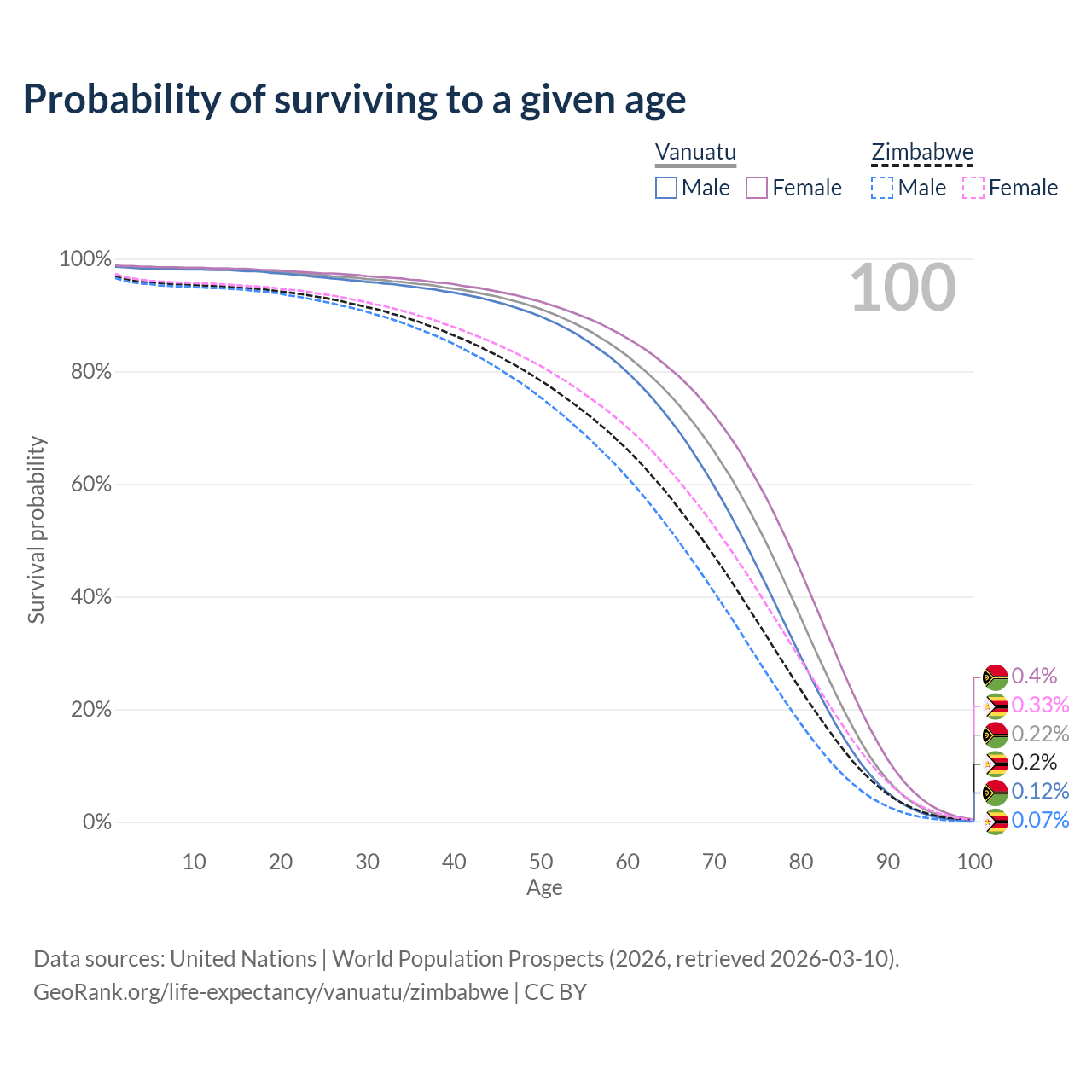 This life expectancy calculator shows the odds of living to 100, 95, 90, and below based on current age for both males and females in Vanuatu and Zimbabwe, along with mean and median age of death. The calculations are based on the 2026 life tables (actuarial tables) from the UN World Population Prospects.