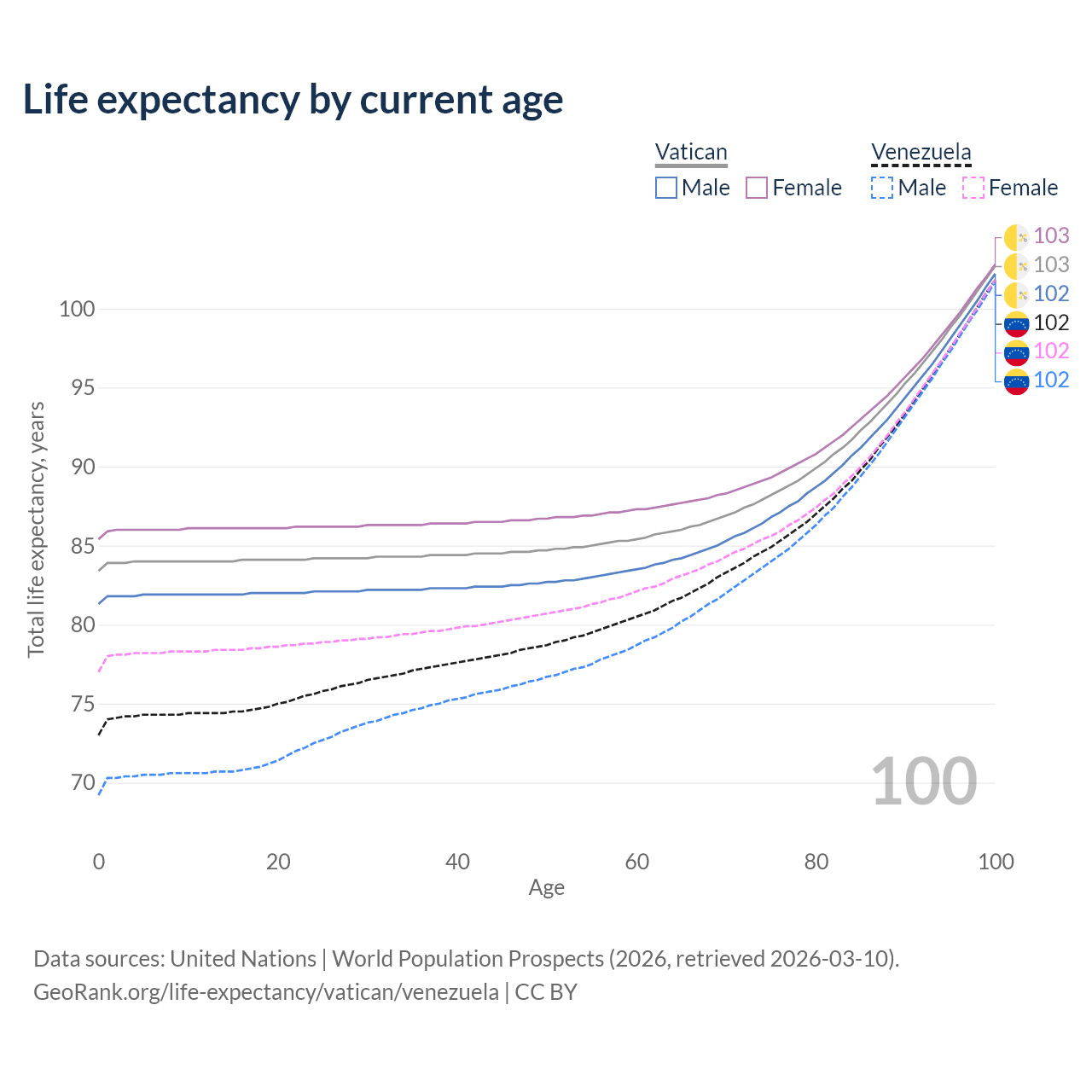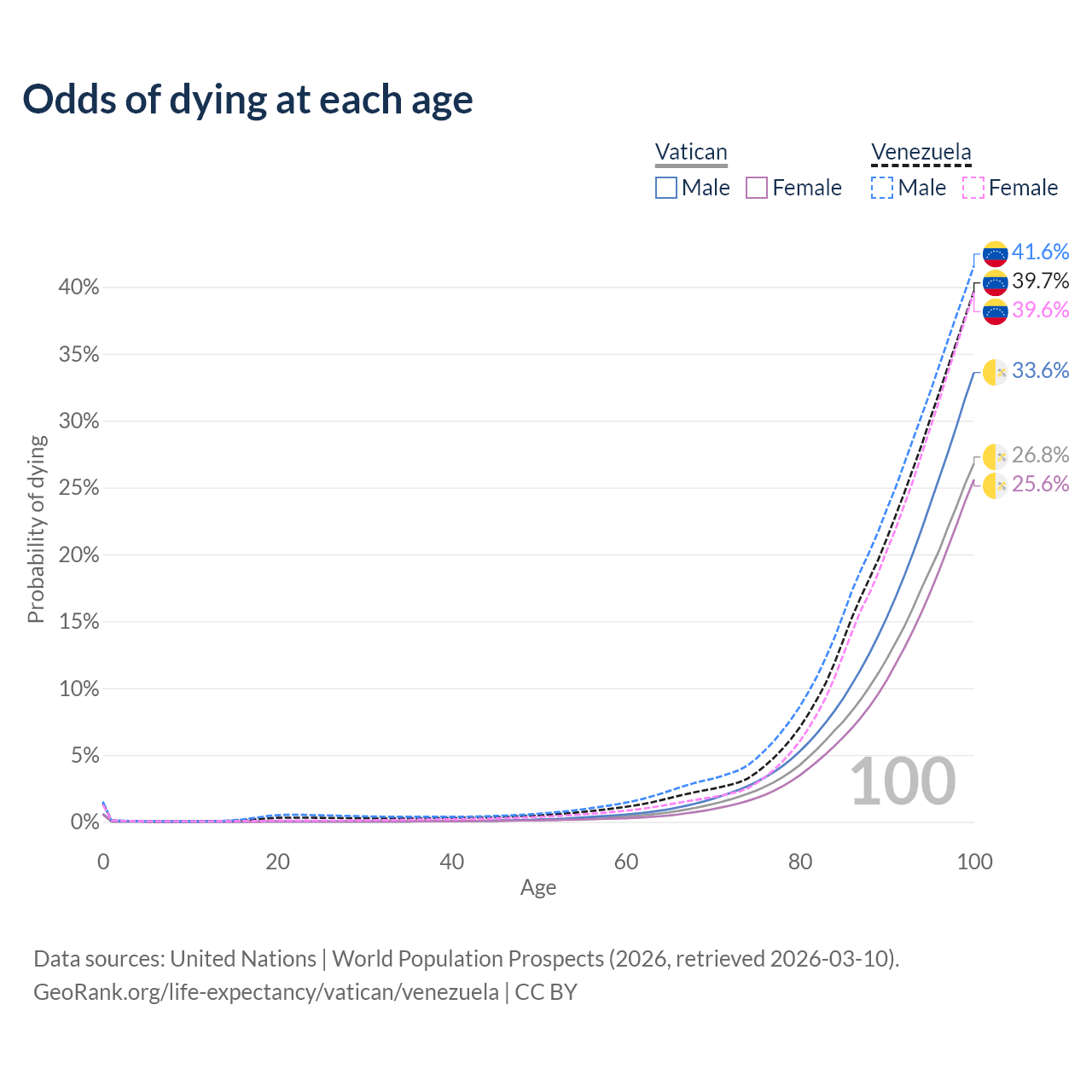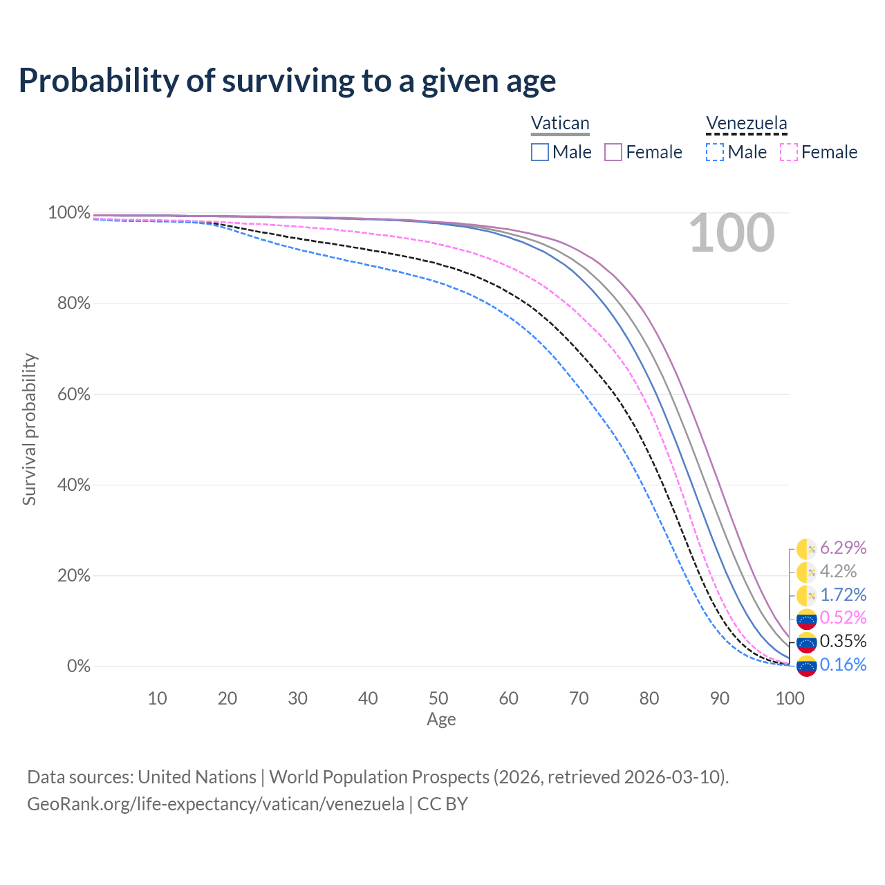 This life expectancy calculator shows the odds of living to 100, 95, 90, and below based on current age for both males and females in the Vatican and Venezuela, along with mean and median age of death. The calculations are based on the 2026 life tables (actuarial tables) from the UN World Population Prospects.
