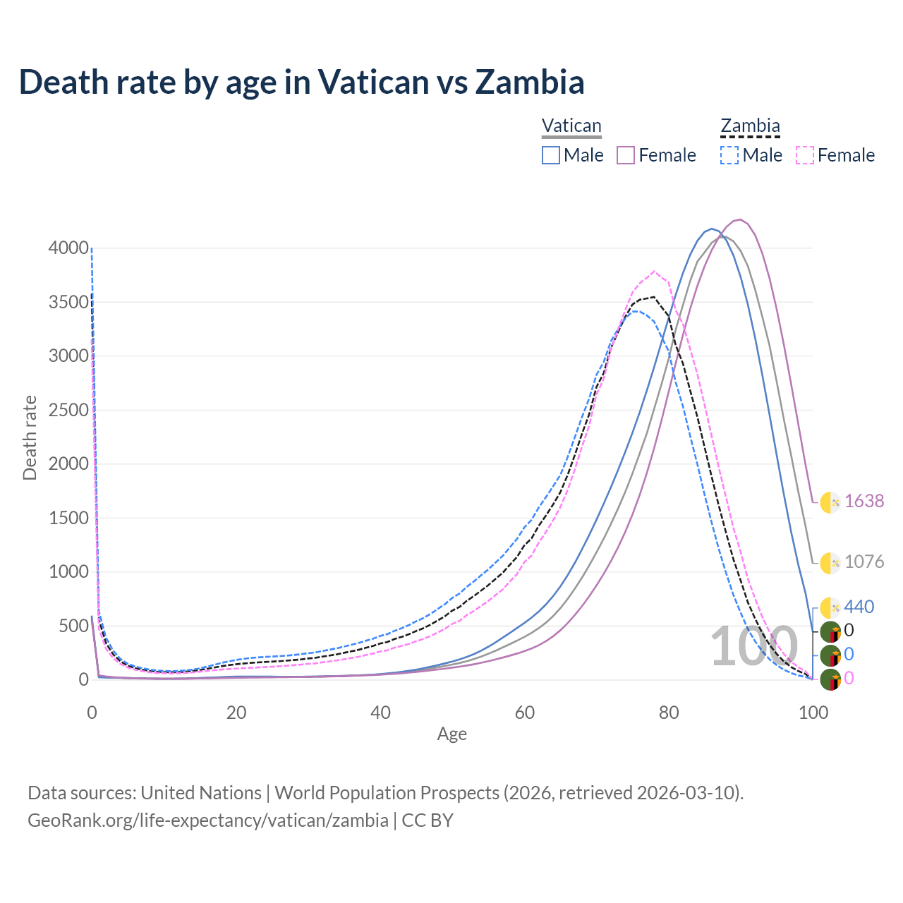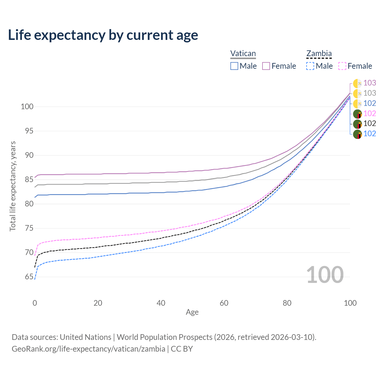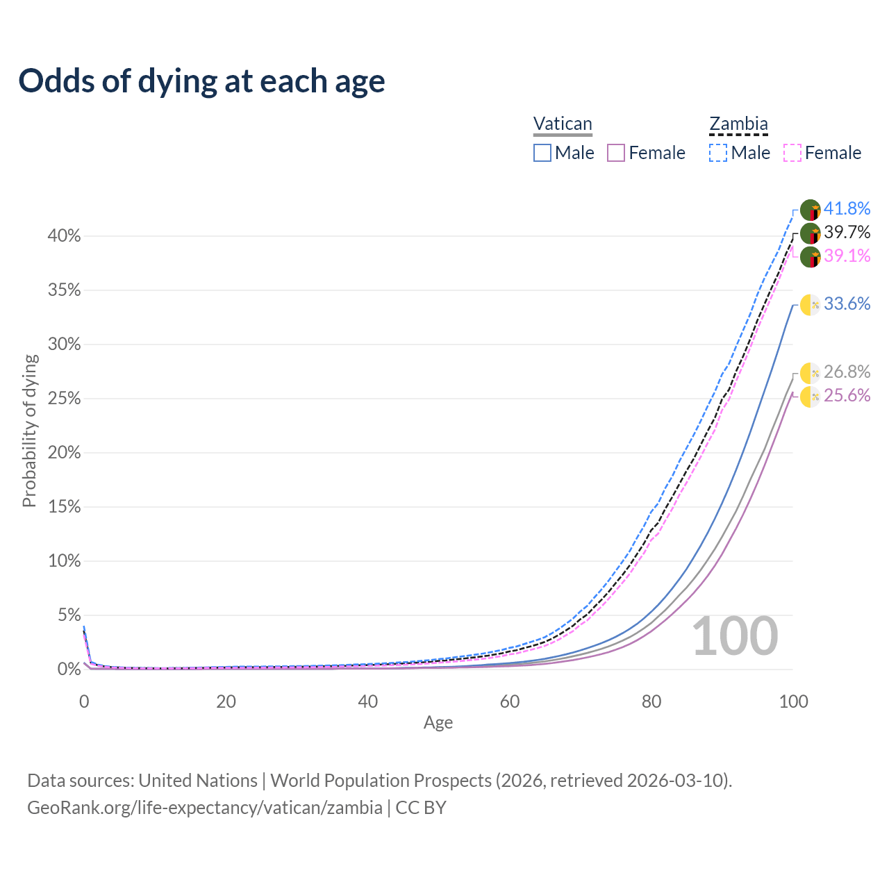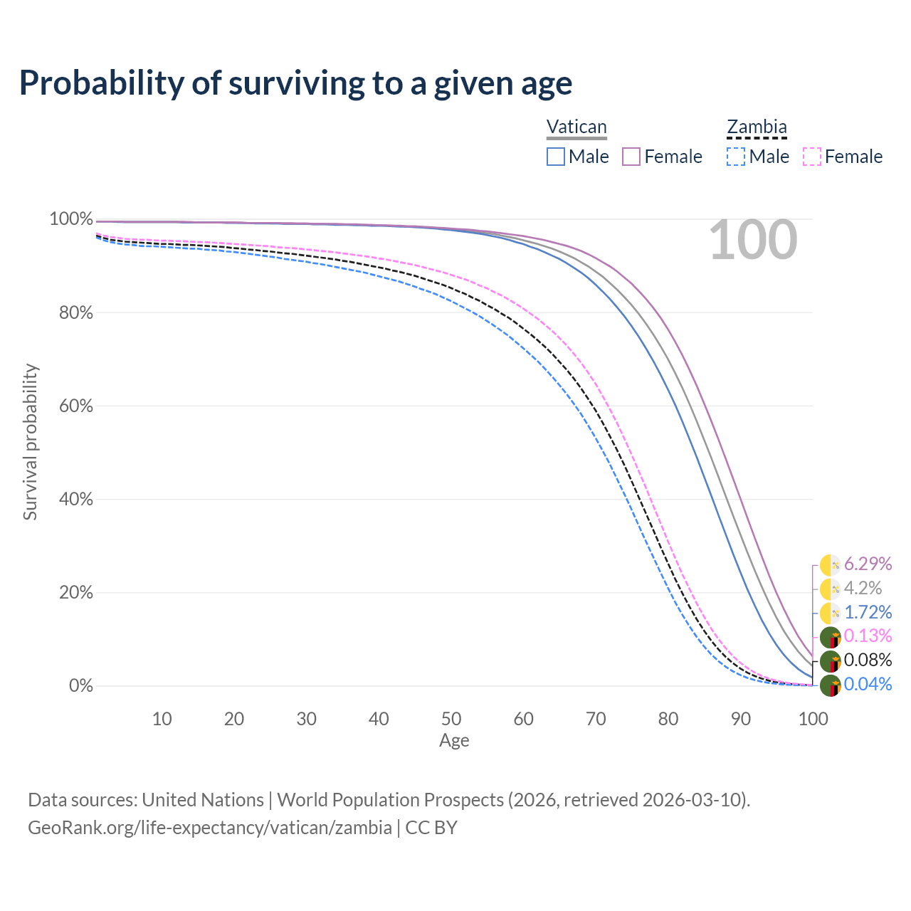 This life expectancy calculator shows the odds of living to 100, 95, 90, and below based on current age for both males and females in the Vatican and Zambia, along with mean and median age of death. The calculations are based on the 2026 life tables (actuarial tables) from the UN World Population Prospects.