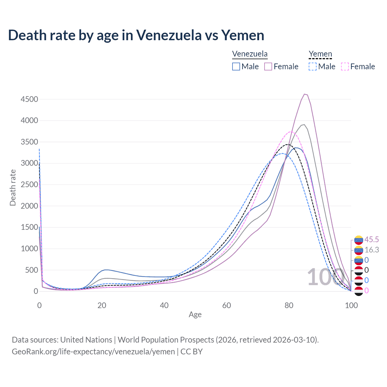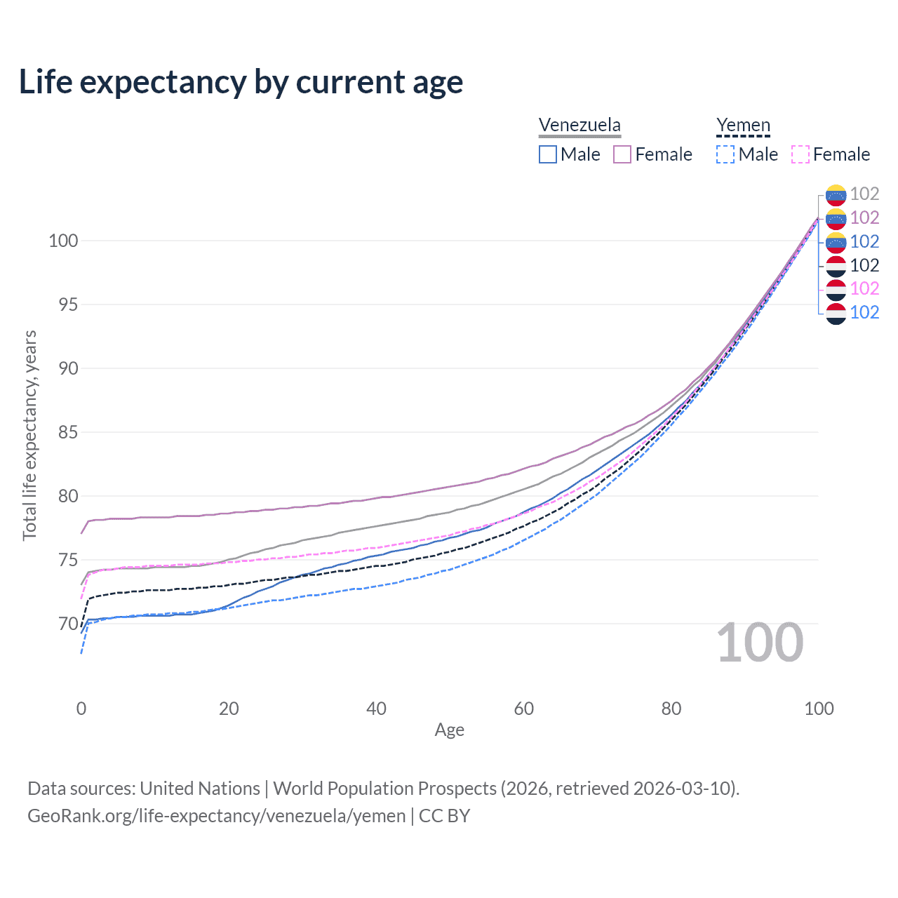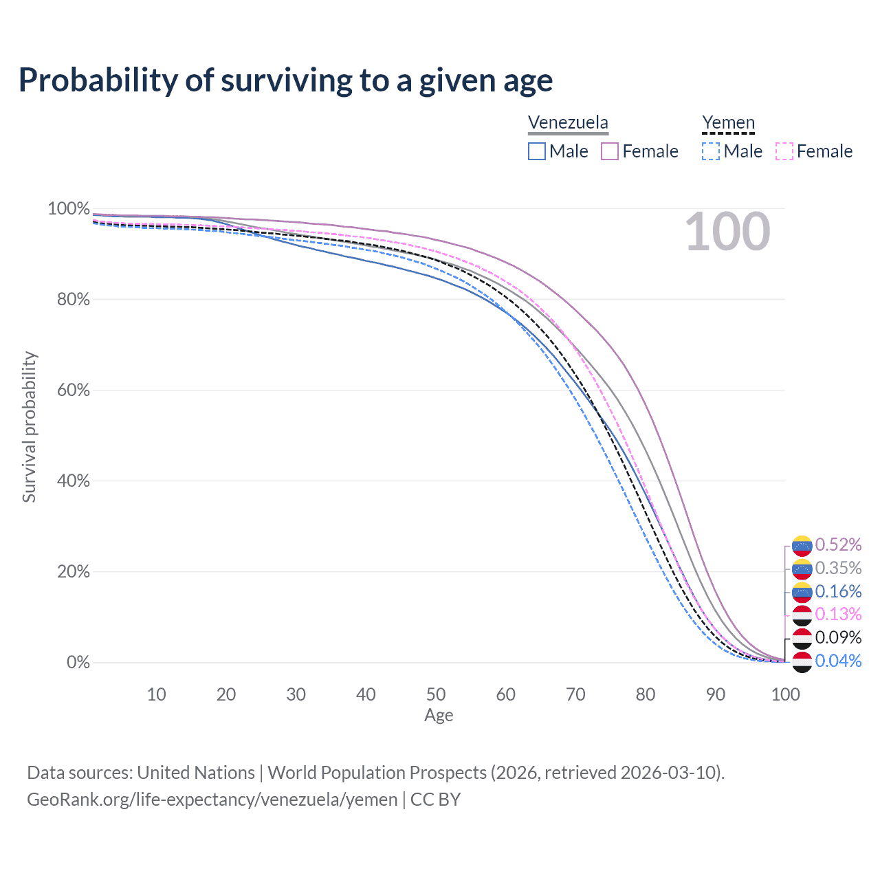 This life expectancy calculator shows the odds of living to 100, 95, 90, and below based on current age for both males and females in Venezuela and Yemen, along with mean and median age of death. The calculations are based on the 2026 life tables (actuarial tables) from the UN World Population Prospects.