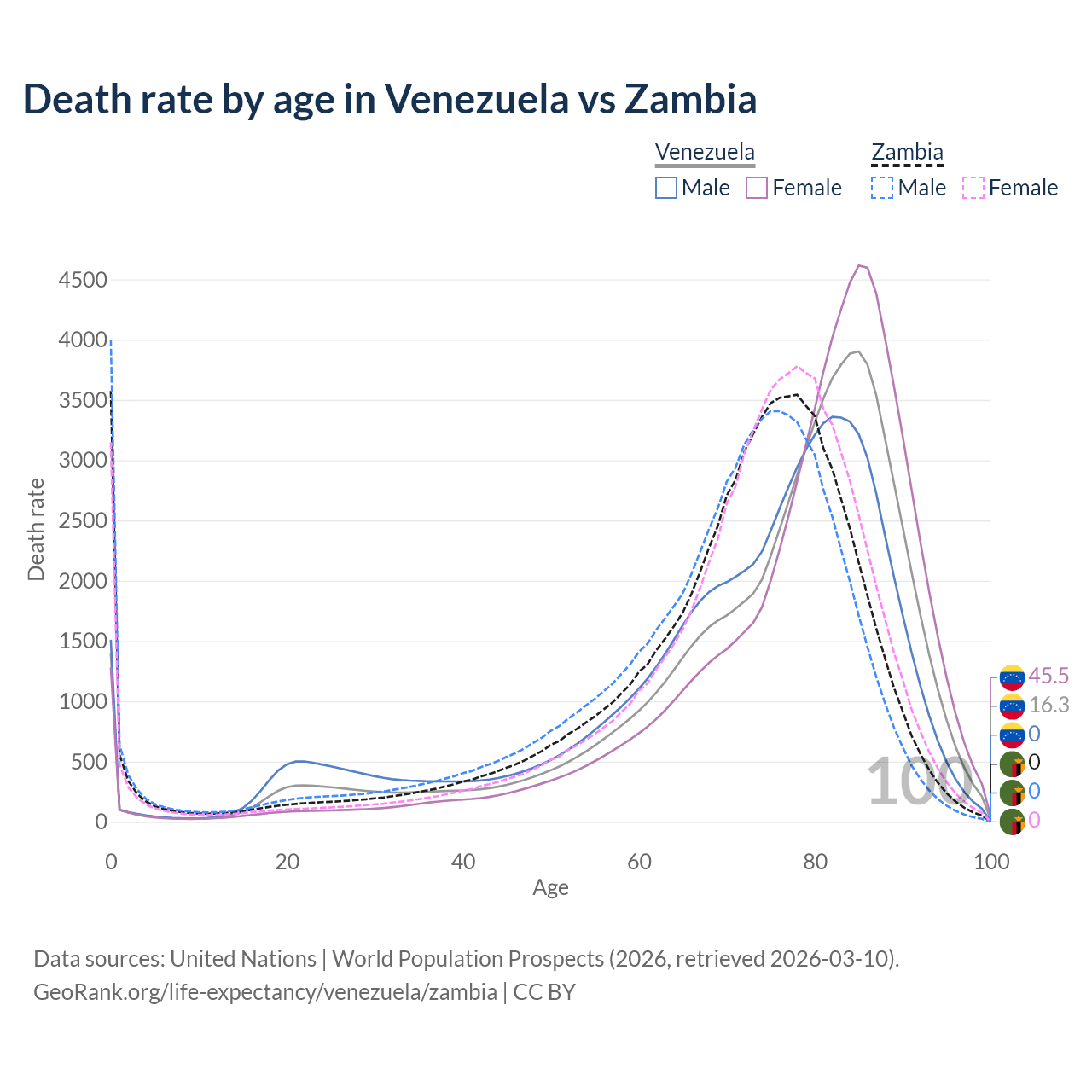 In Venezuela, the most common age of death is 85, compared to 0 in Zambia. The median age of death is 79 in Venezuela and 73.1 in Zambia, meaning only half of each cohort is expected to live past that age.