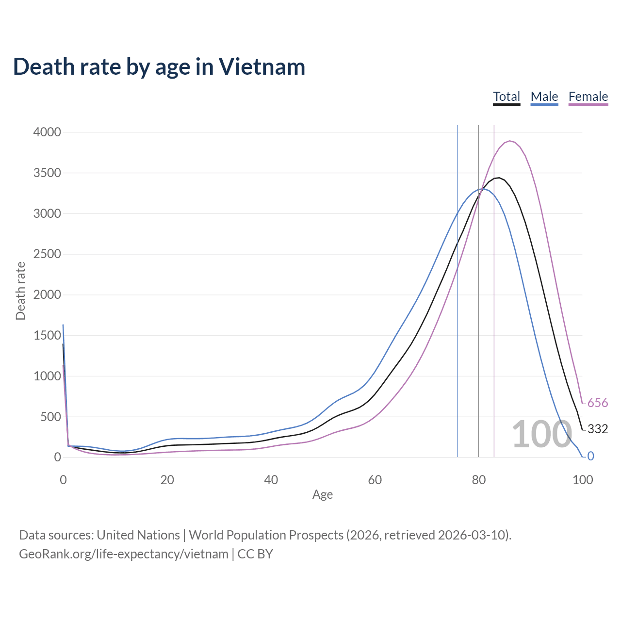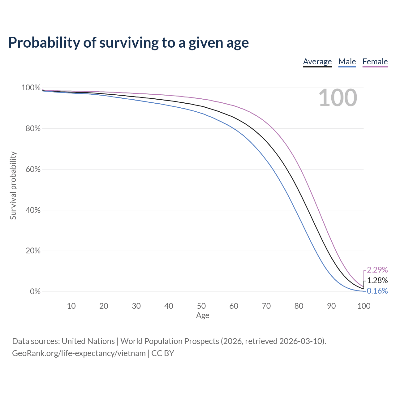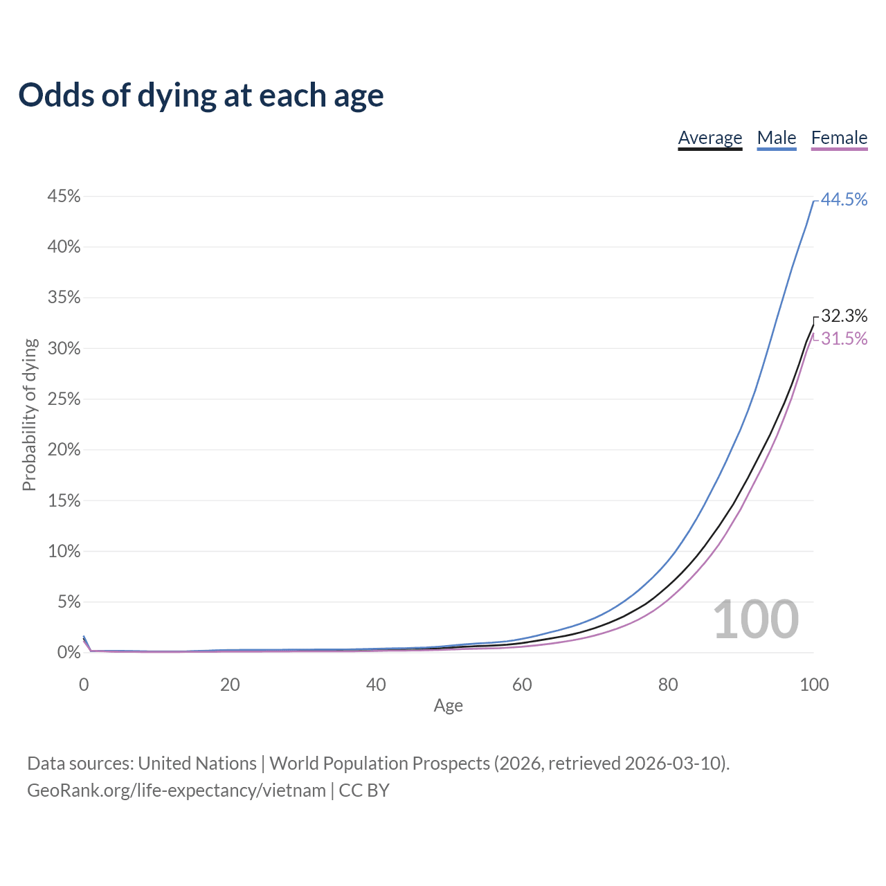 This life expectancy calculator shows the odds of living to 100, 95, 90, and below based on current age for both males and females in Vietnam, along with mean and median age of death. The calculations are based on the 2026 life tables (actuarial tables) from the UN World Population Prospects.