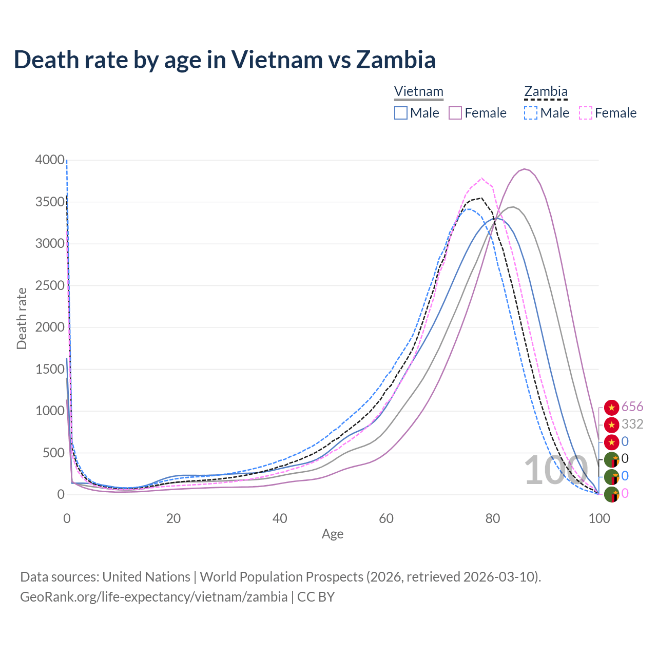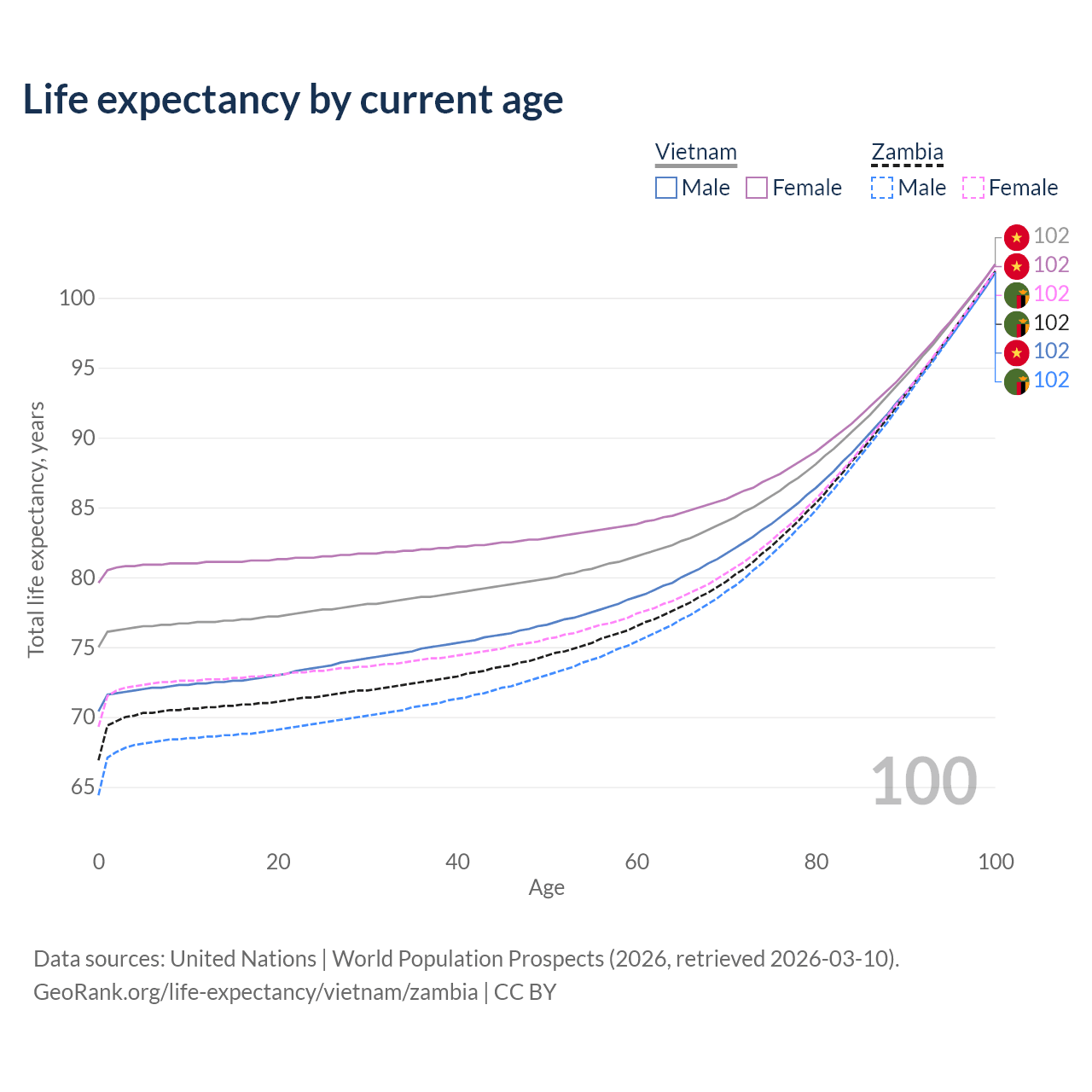 This life expectancy calculator shows the odds of living to 100, 95, 90, and below based on current age for both males and females in Vietnam and Zambia, along with mean and median age of death. The calculations are based on the 2026 life tables (actuarial tables) from the UN World Population Prospects.