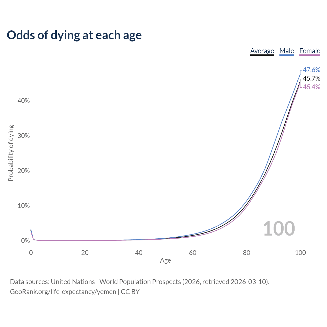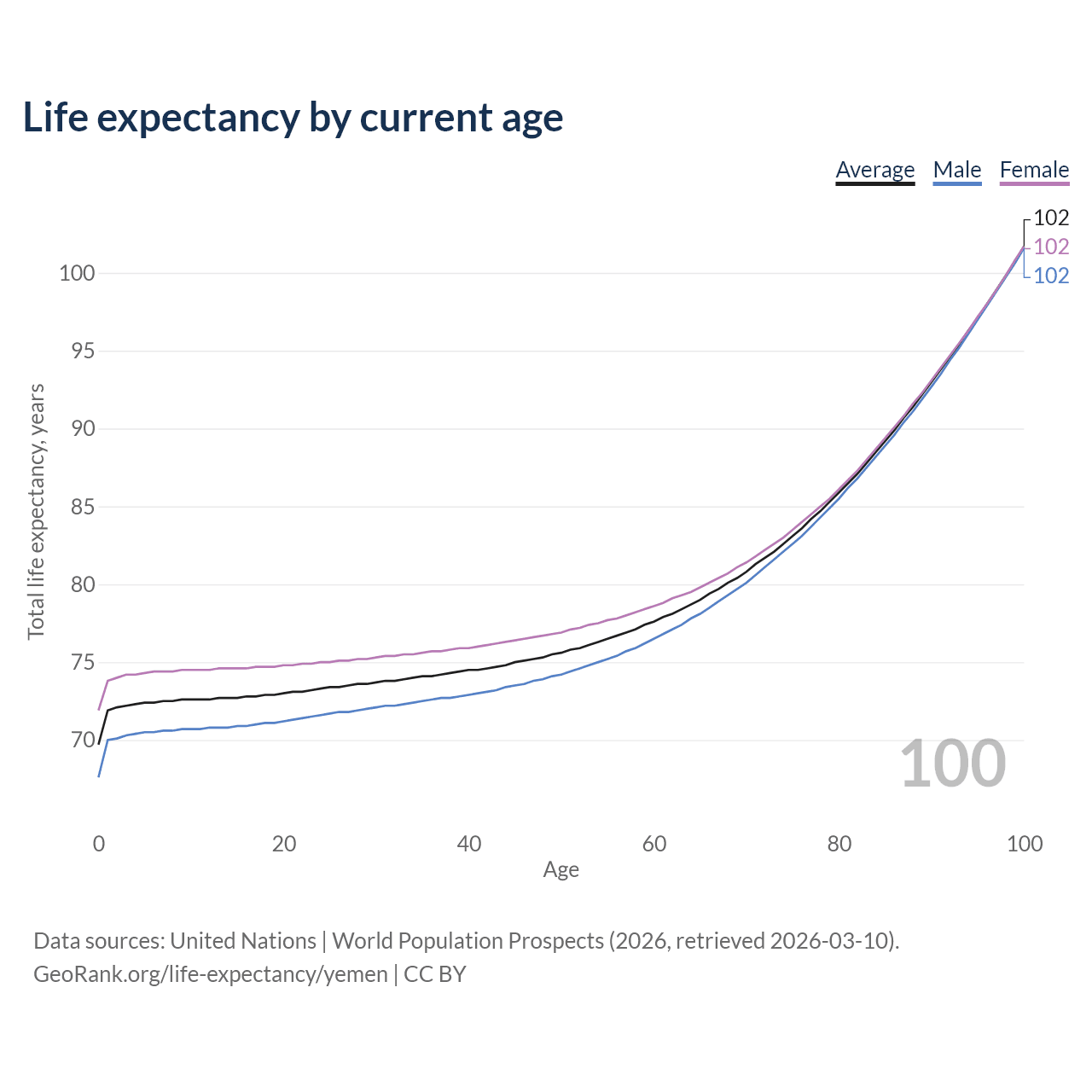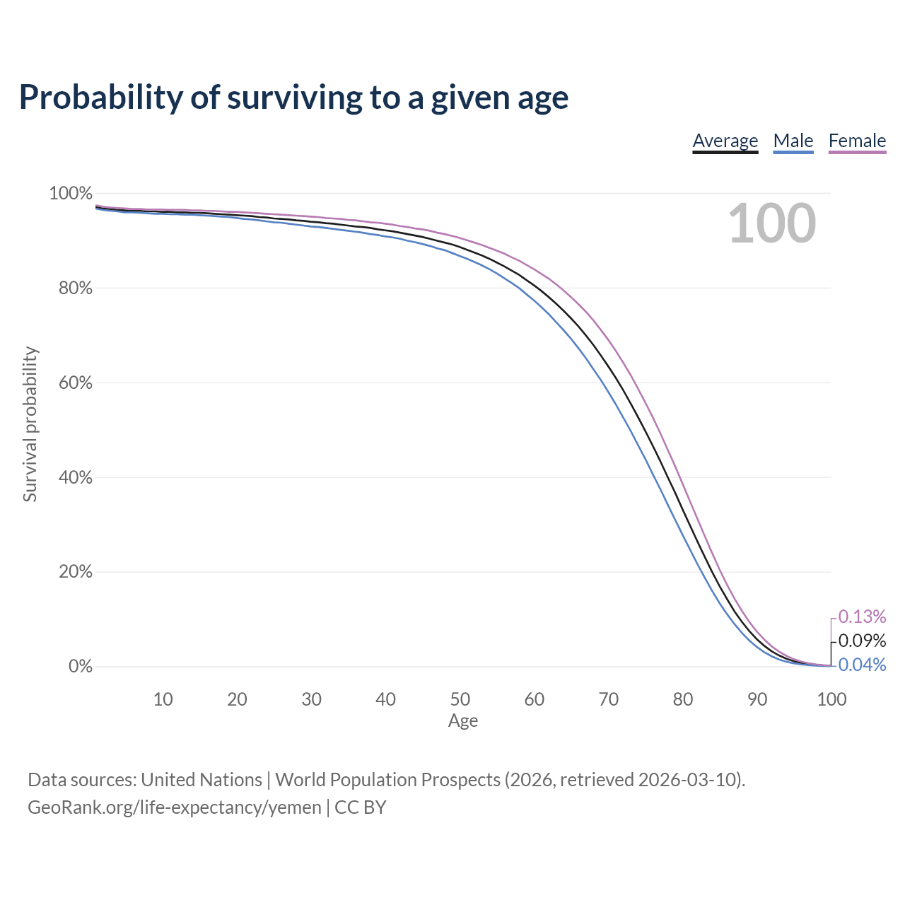 This life expectancy calculator shows the odds of living to 100, 95, 90, and below based on current age for both males and females in Yemen, along with mean and median age of death. The calculations are based on the 2026 life tables (actuarial tables) from the UN World Population Prospects.