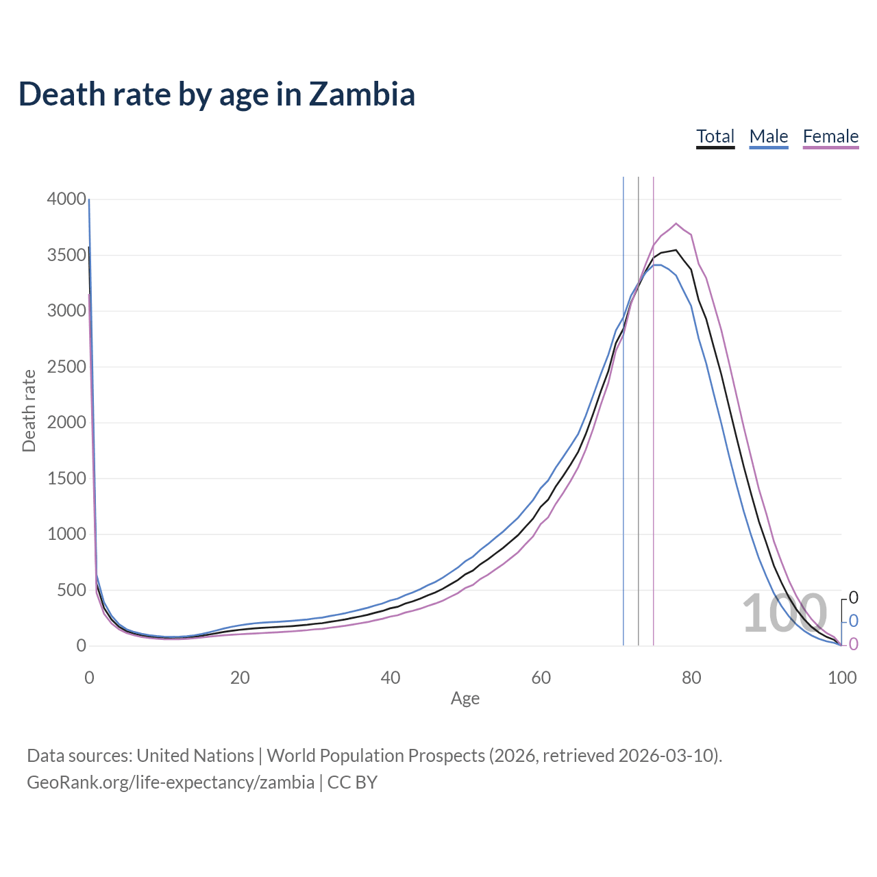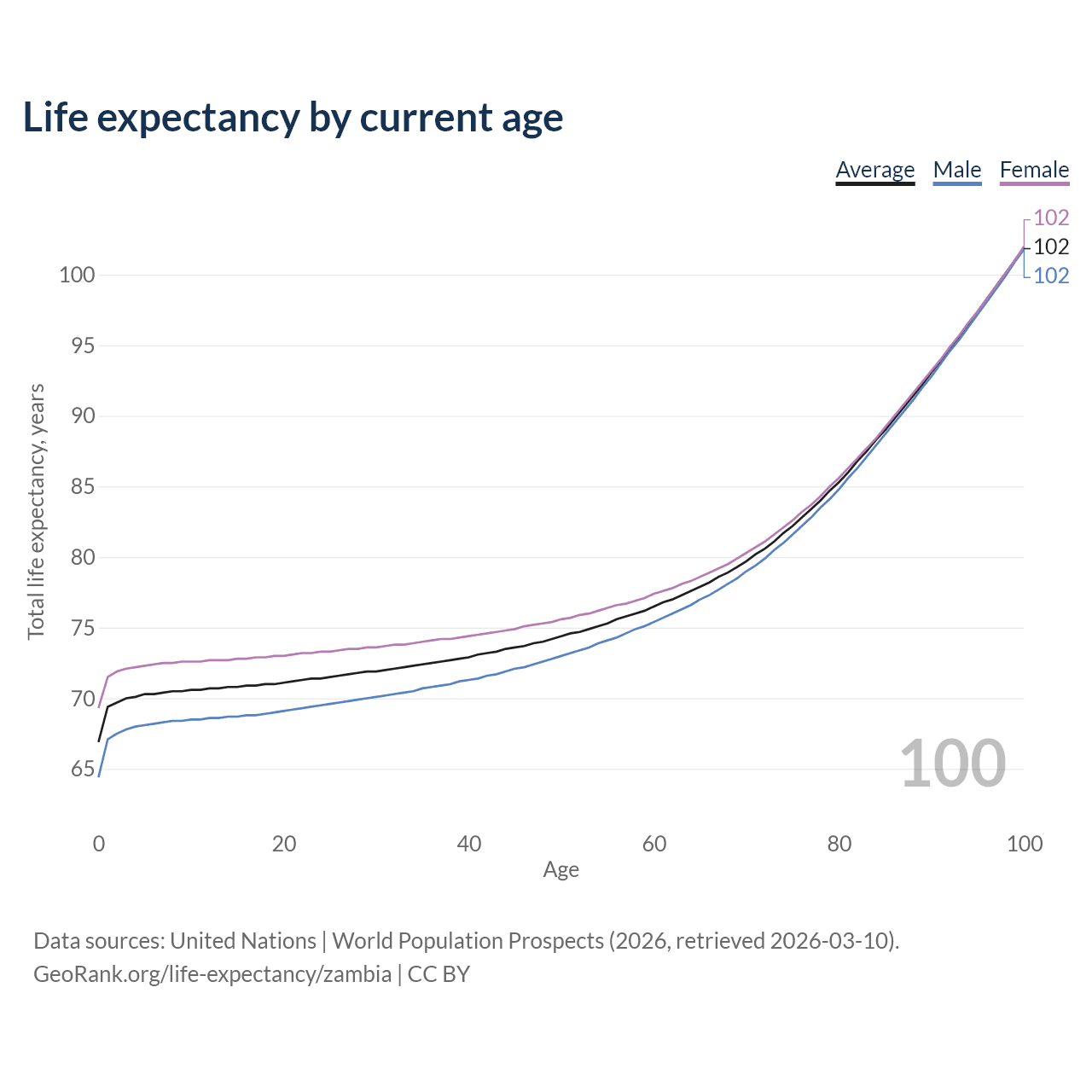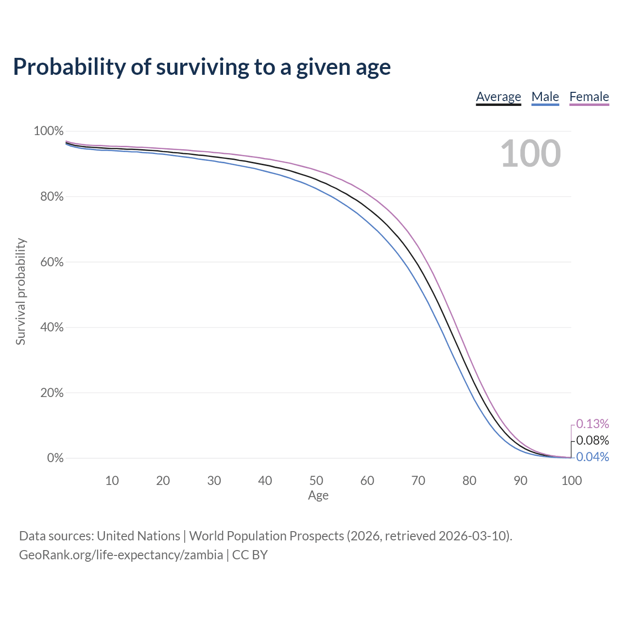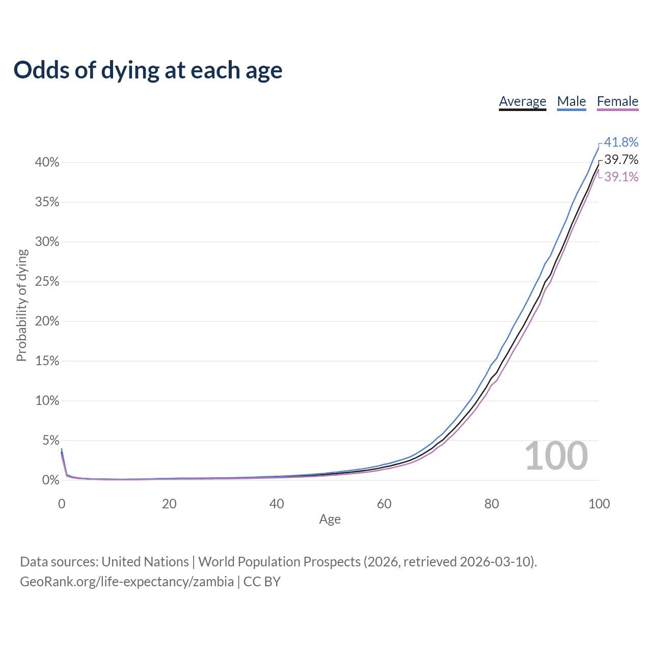 This life expectancy calculator shows the odds of living to 100, 95, 90, and below based on current age for both males and females in Zambia, along with mean and median age of death. The calculations are based on the 2026 life tables (actuarial tables) from the UN World Population Prospects.