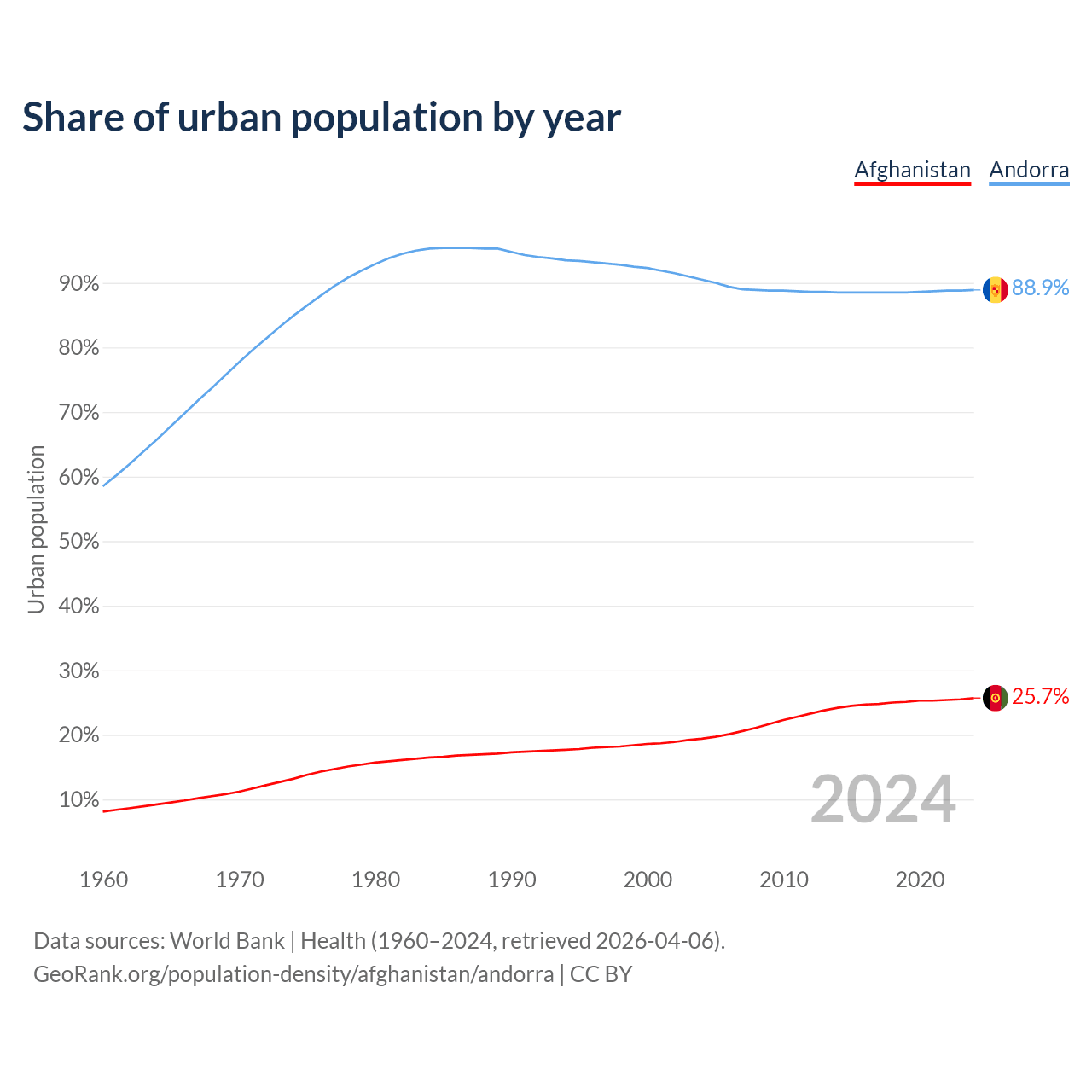 From 2004 to 2024, the share of urban population changed from 19.4% to 25.7% in Afghanistan and from 90.5% to 88.9% in Andorra.