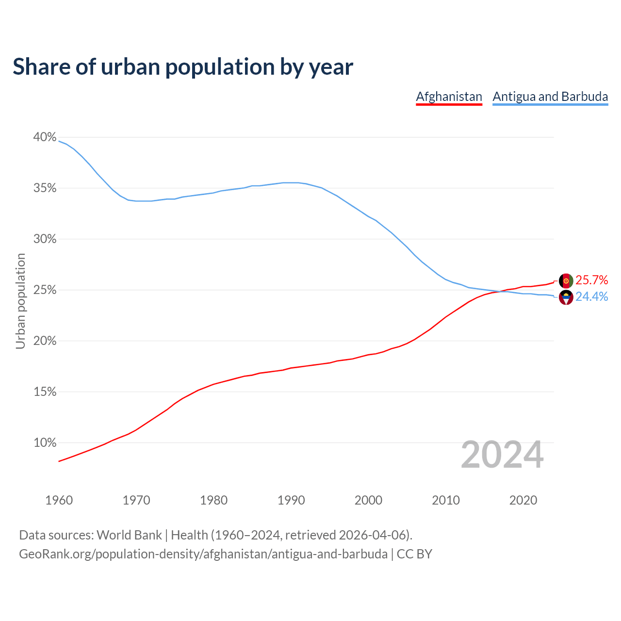 From 2004 to 2024, the share of urban population changed from 19.4% to 25.7% in Afghanistan and from 29.9% to 24.4% in Antigua and Barbuda.
