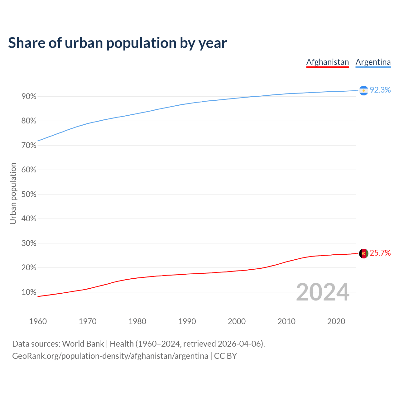 From 2004 to 2024, the share of urban population changed from 19.4% to 25.7% in Afghanistan and from 89.9% to 92.3% in Argentina.