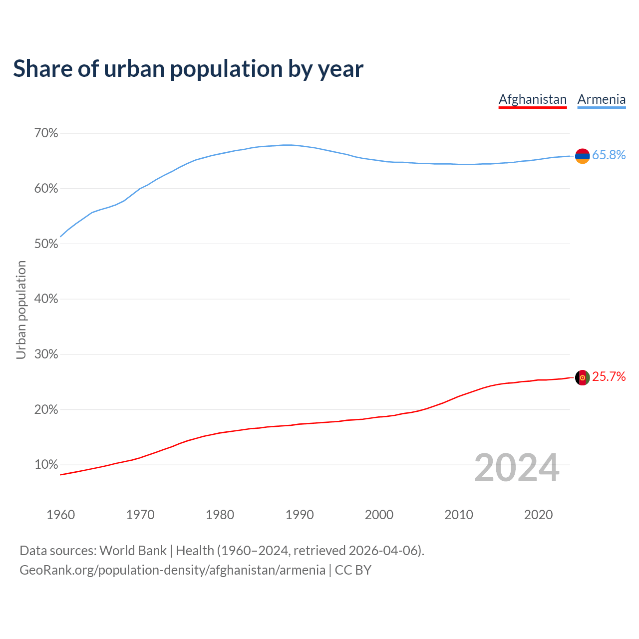 From 2004 to 2024, the share of urban population changed from 19.4% to 25.7% in Afghanistan and from 64.6% to 65.8% in Armenia.