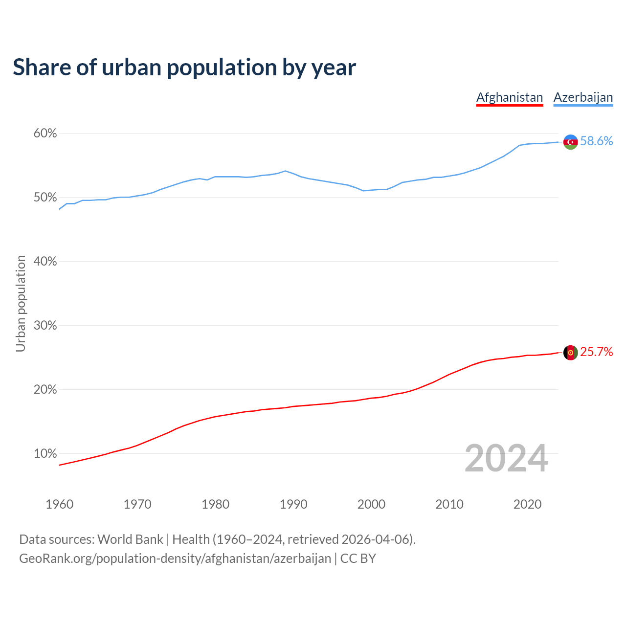 From 2004 to 2024, the share of urban population changed from 19.4% to 25.7% in Afghanistan and from 52.3% to 58.6% in Azerbaijan.
