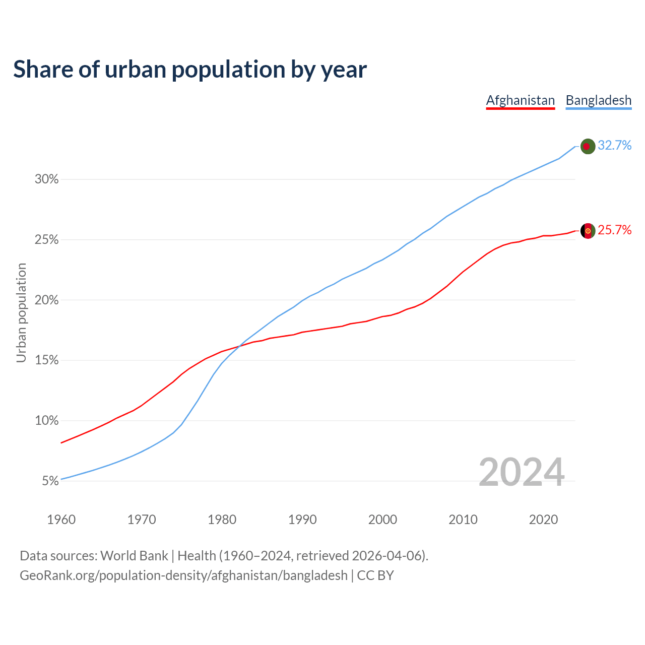 From 2004 to 2024, the share of urban population changed from 19.4% to 25.7% in Afghanistan and from 25% to 32.7% in Bangladesh.