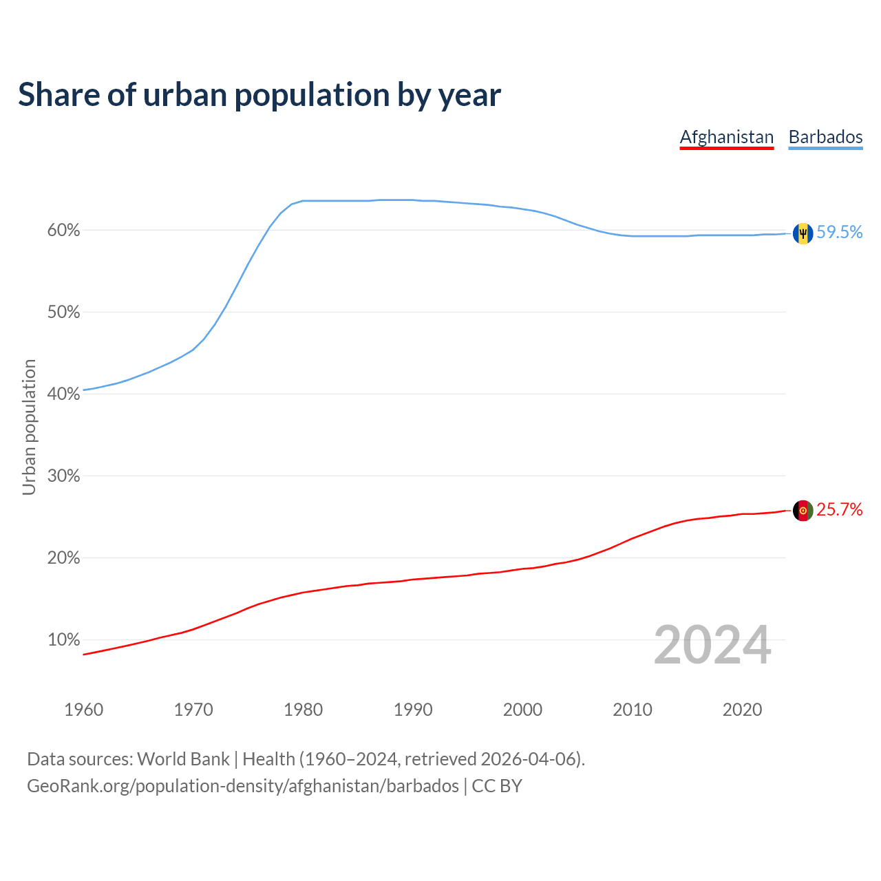 From 2004 to 2024, the share of urban population changed from 19.4% to 25.7% in Afghanistan and from 61.1% to 59.5% in Barbados.