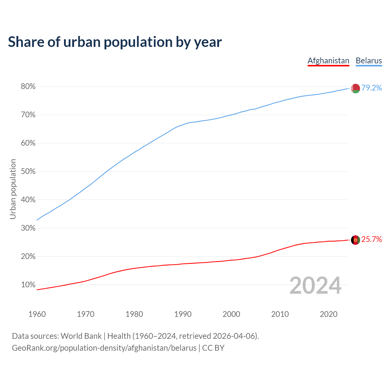 From 2004 to 2024, the share of urban population changed from 19.4% to 25.7% in Afghanistan and from 71.8% to 79.2% in Belarus.