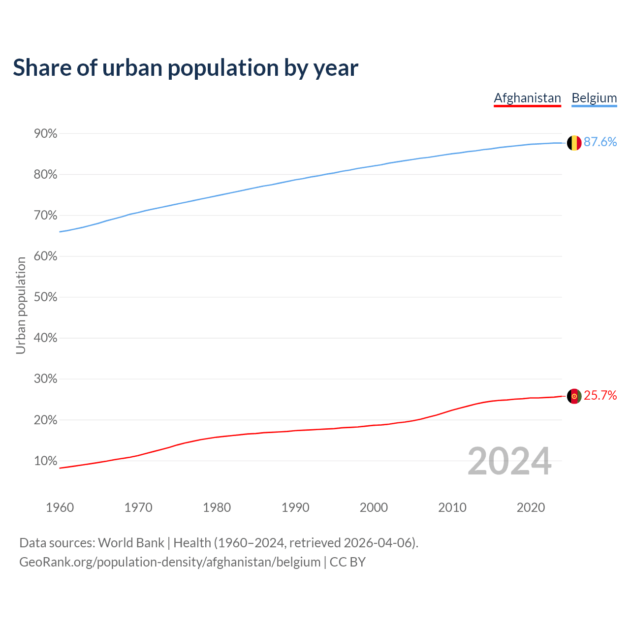 From 2004 to 2024, the share of urban population changed from 19.4% to 25.7% in Afghanistan and from 83.3% to 87.6% in Belgium.