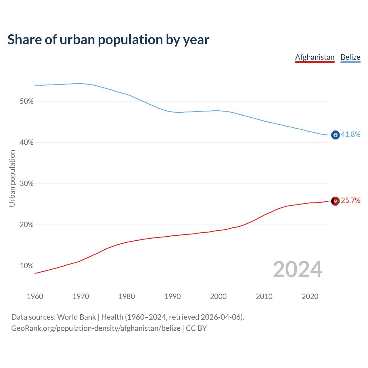 From 2004 to 2024, the share of urban population changed from 19.4% to 25.7% in Afghanistan and from 47% to 41.8% in Belize.