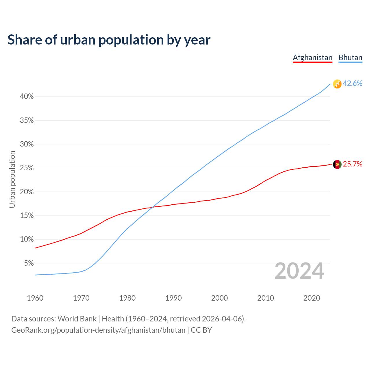 From 2004 to 2024, the share of urban population changed from 19.4% to 25.7% in Afghanistan and from 30.3% to 42.6% in Bhutan.