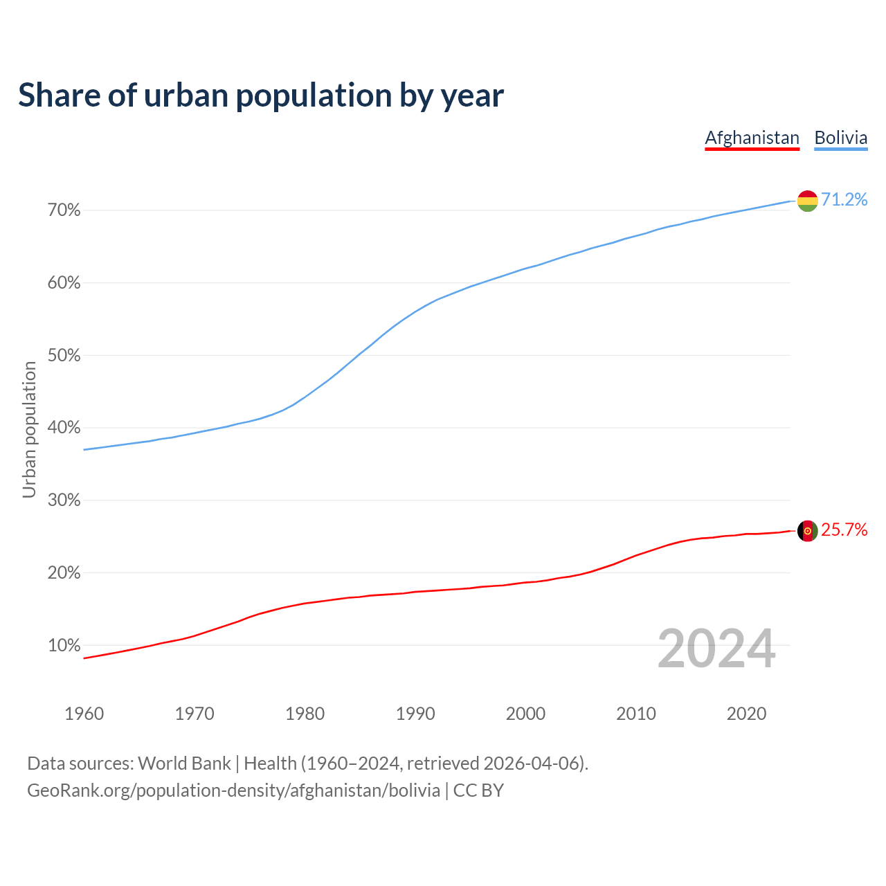 From 2004 to 2024, the share of urban population changed from 19.4% to 25.7% in Afghanistan and from 63.8% to 71.2% in Bolivia.