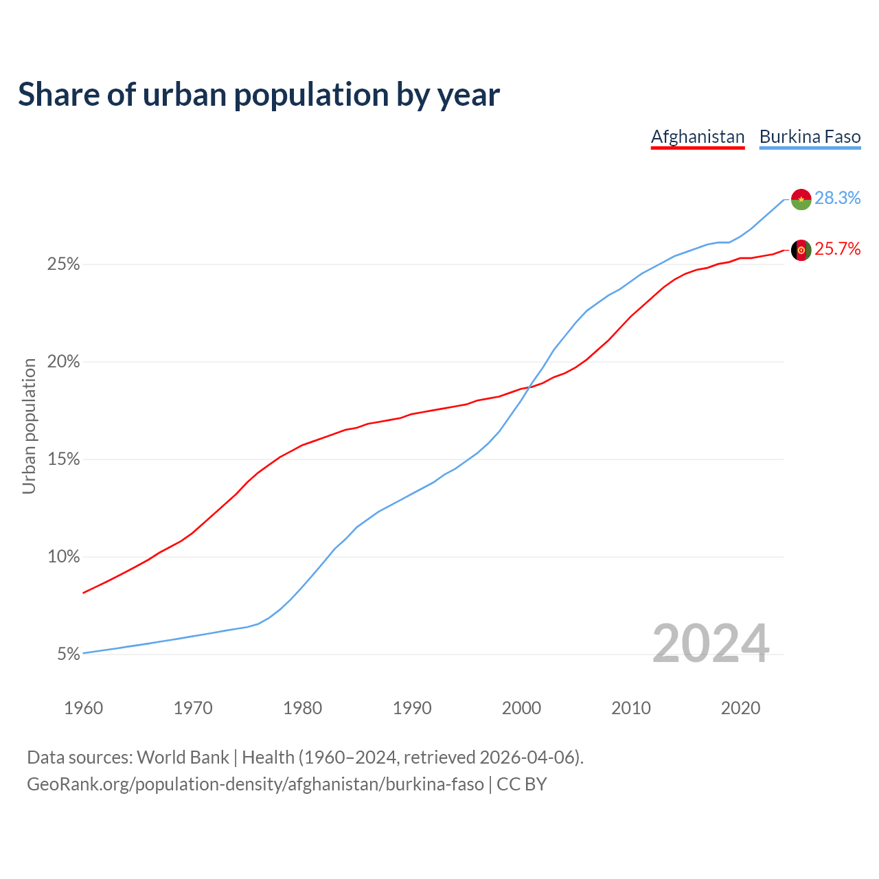 From 2006 to 2026, population density in Afghanistan increased by 77.3%, compared to a 71.2% growth in Burkina Faso.
