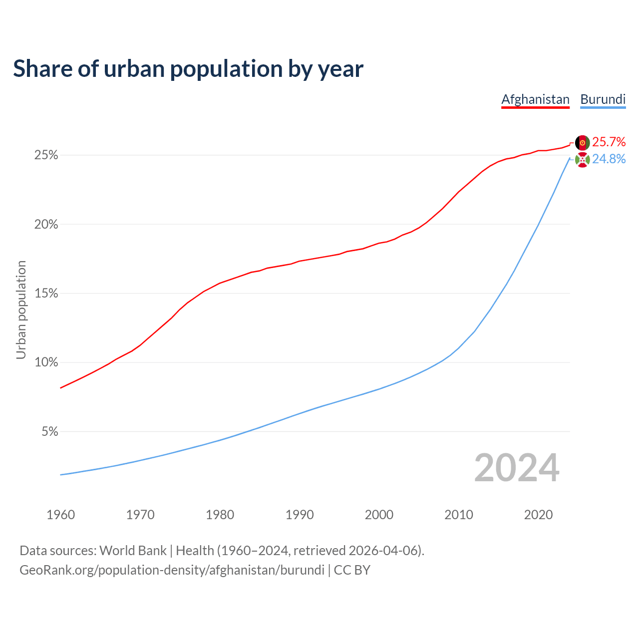 From 2004 to 2024, the share of urban population changed from 19.4% to 25.7% in Afghanistan and from 8.92% to 24.8% in Burundi.