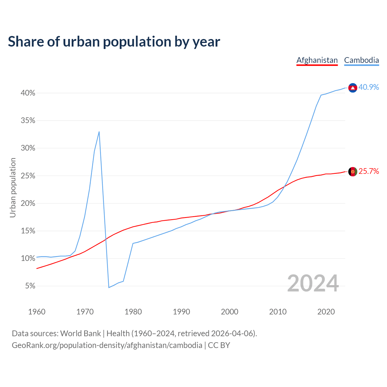 From 2006 to 2026, population density in Afghanistan increased by 77.3%, compared to a 32.4% growth in Cambodia.