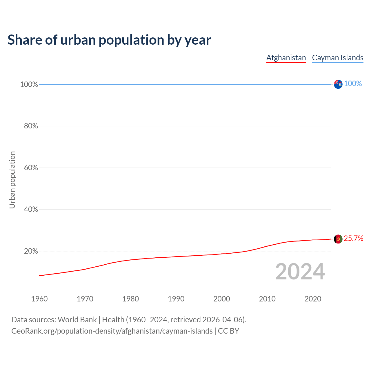 From 2004 to 2024, the share of urban population changed from 19.4% to 25.7% in Afghanistan and from 100% to 100% in the Cayman Islands.
