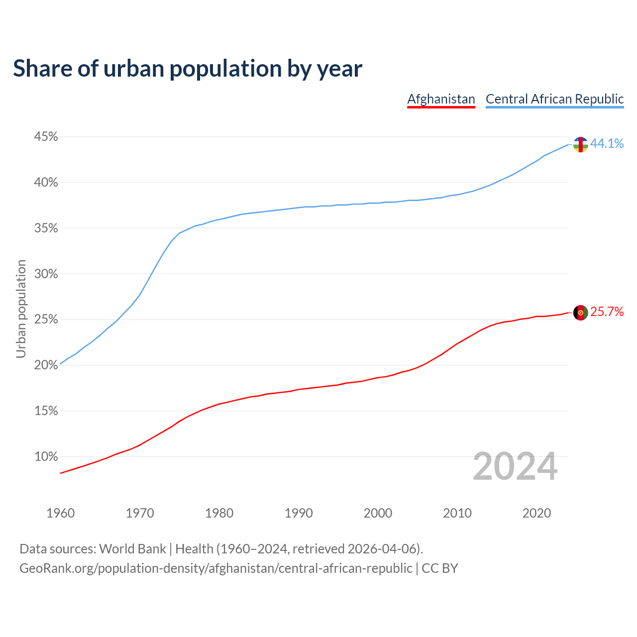 From 2004 to 2024, the share of urban population changed from 19.4% to 25.7% in Afghanistan and from 38% to 44.1% in the Central African Republic.