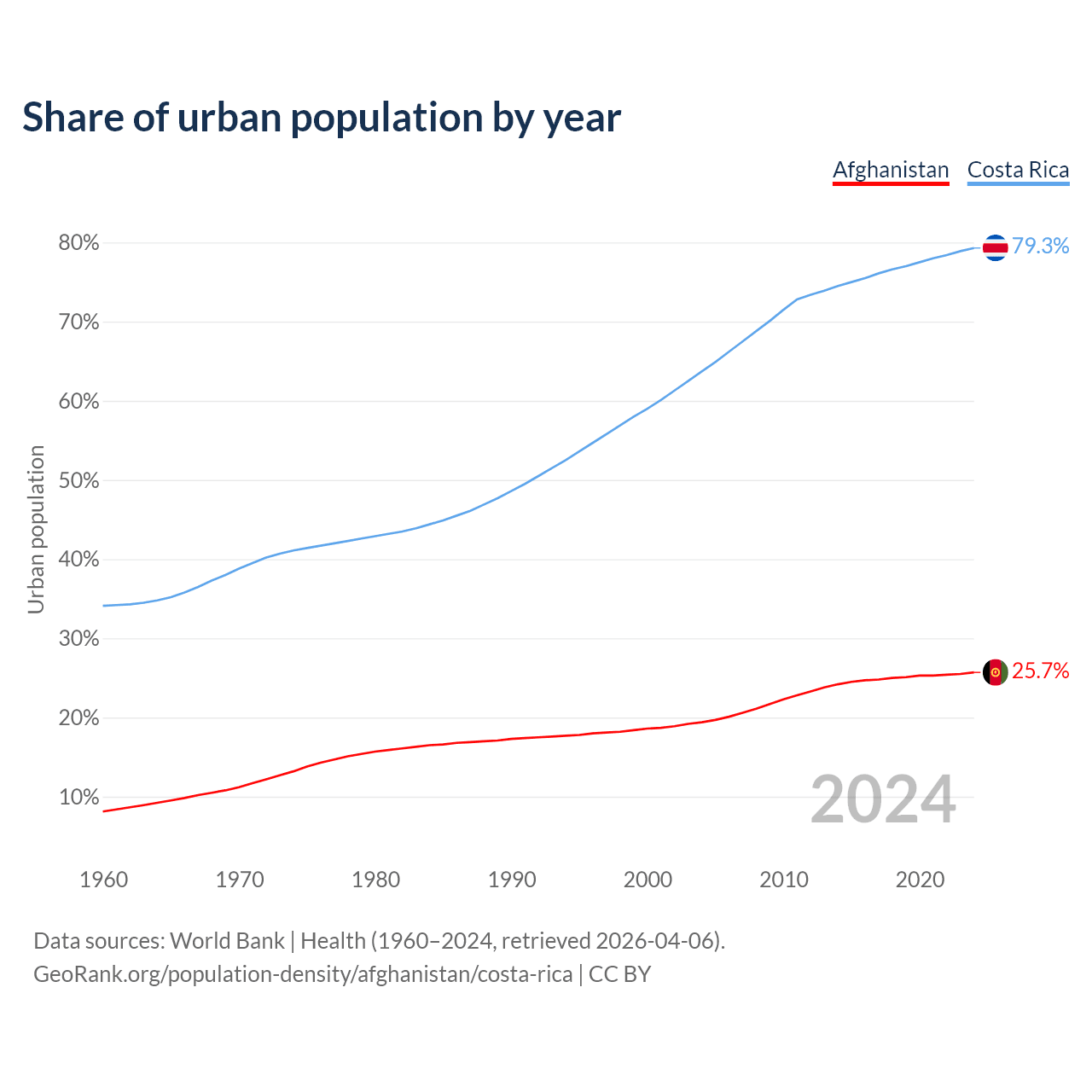 From 2004 to 2024, the share of urban population changed from 19.4% to 25.7% in Afghanistan and from 63.7% to 79.3% in Costa Rica.