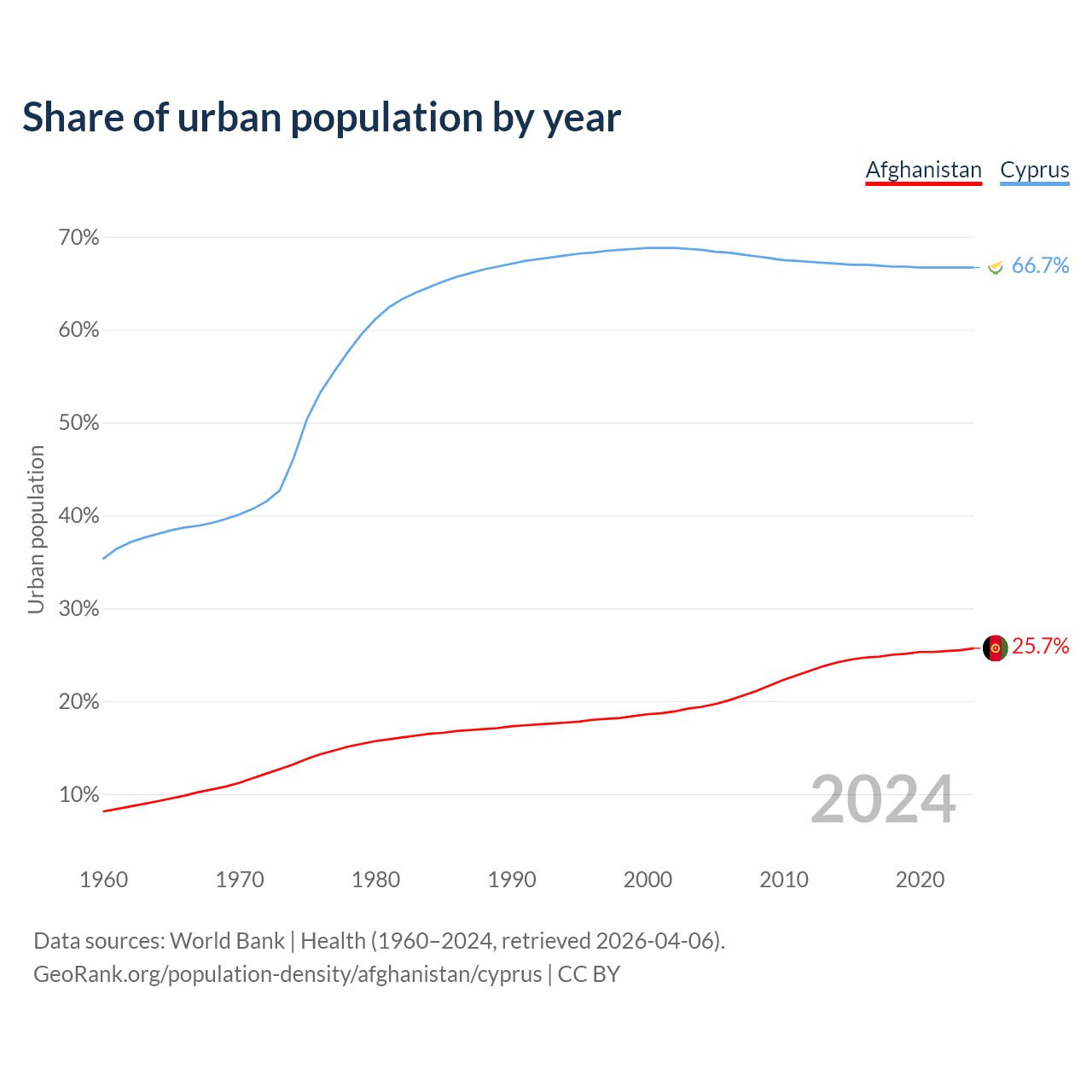 From 2004 to 2024, the share of urban population changed from 19.4% to 25.7% in Afghanistan and from 68.6% to 66.7% in Cyprus.
