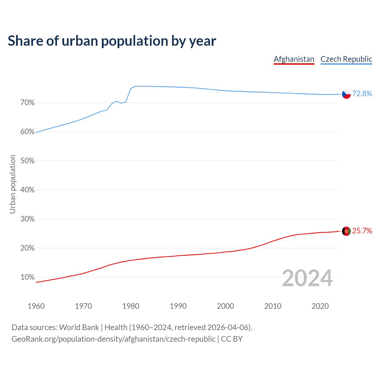From 2004 to 2024, the share of urban population changed from 19.4% to 25.7% in Afghanistan and from 73.7% to 72.8% in the Czech Republic.