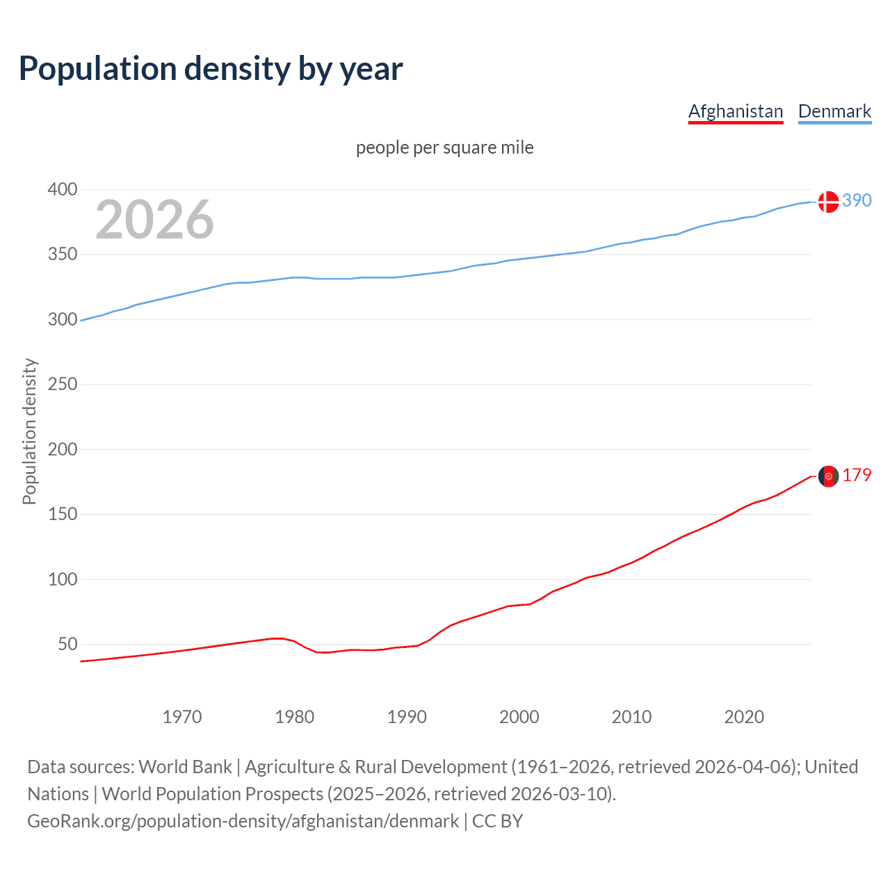 From 2006 to 2026, population density in Afghanistan increased by 77.3%, compared to a 10.9% growth in Denmark.