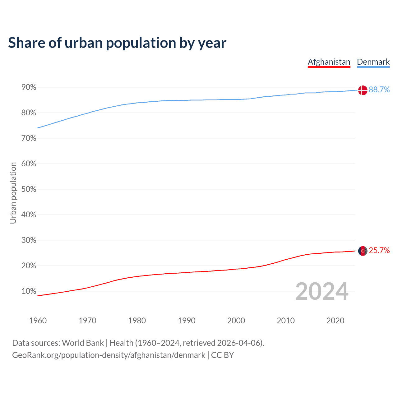 From 2004 to 2024, the share of urban population changed from 19.4% to 25.7% in Afghanistan and from 85.7% to 88.7% in Denmark.