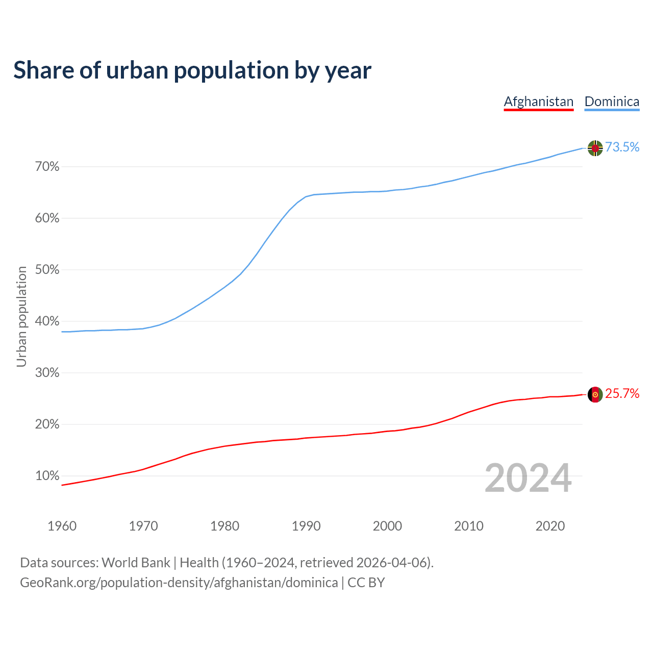 From 2004 to 2024, the share of urban population changed from 19.4% to 25.7% in Afghanistan and from 66% to 73.5% in Dominica.