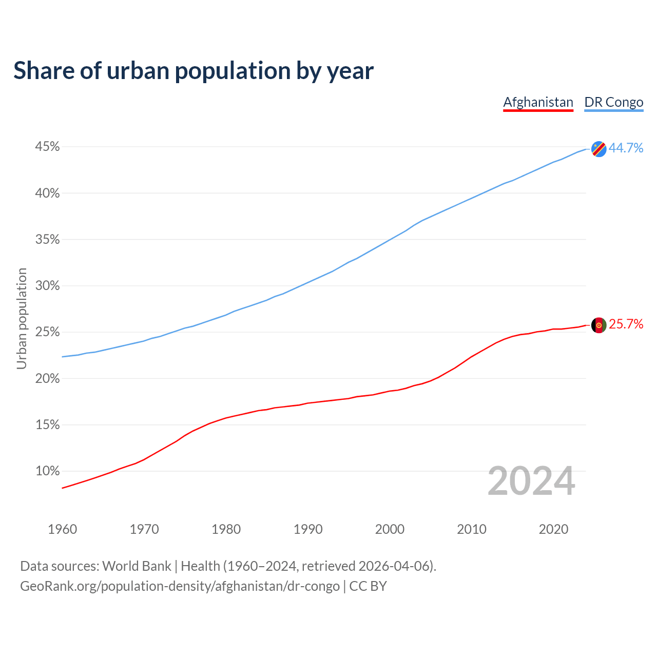 From 2004 to 2024, the share of urban population changed from 19.4% to 25.7% in Afghanistan and from 37% to 44.7% in the DR Congo.