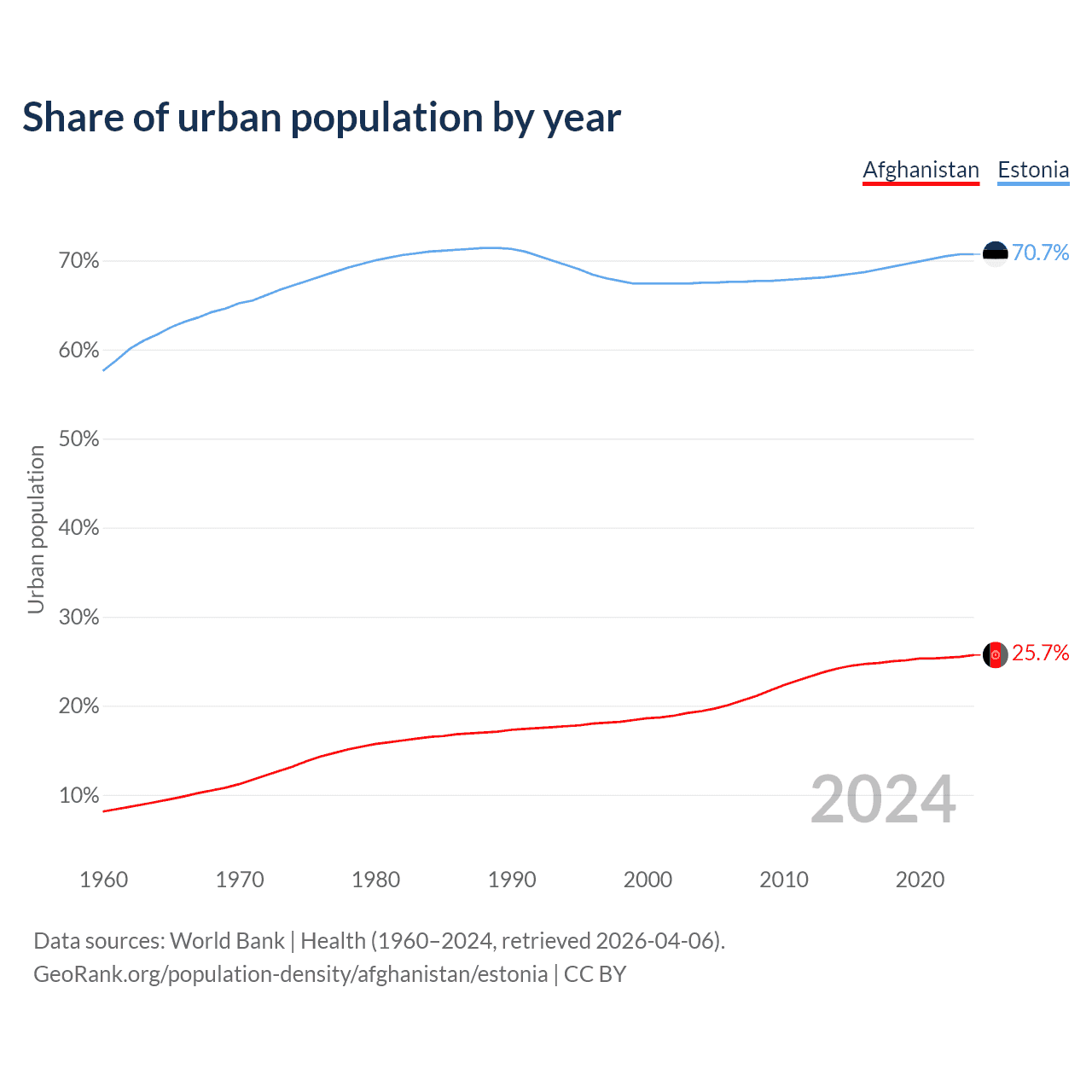 From 2004 to 2024, the share of urban population changed from 19.4% to 25.7% in Afghanistan and from 67.5% to 70.7% in Estonia.
