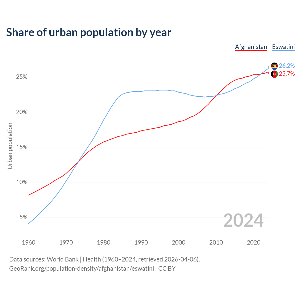 From 2004 to 2024, the share of urban population changed from 19.4% to 25.7% in Afghanistan and from 22.3% to 26.2% in Eswatini.