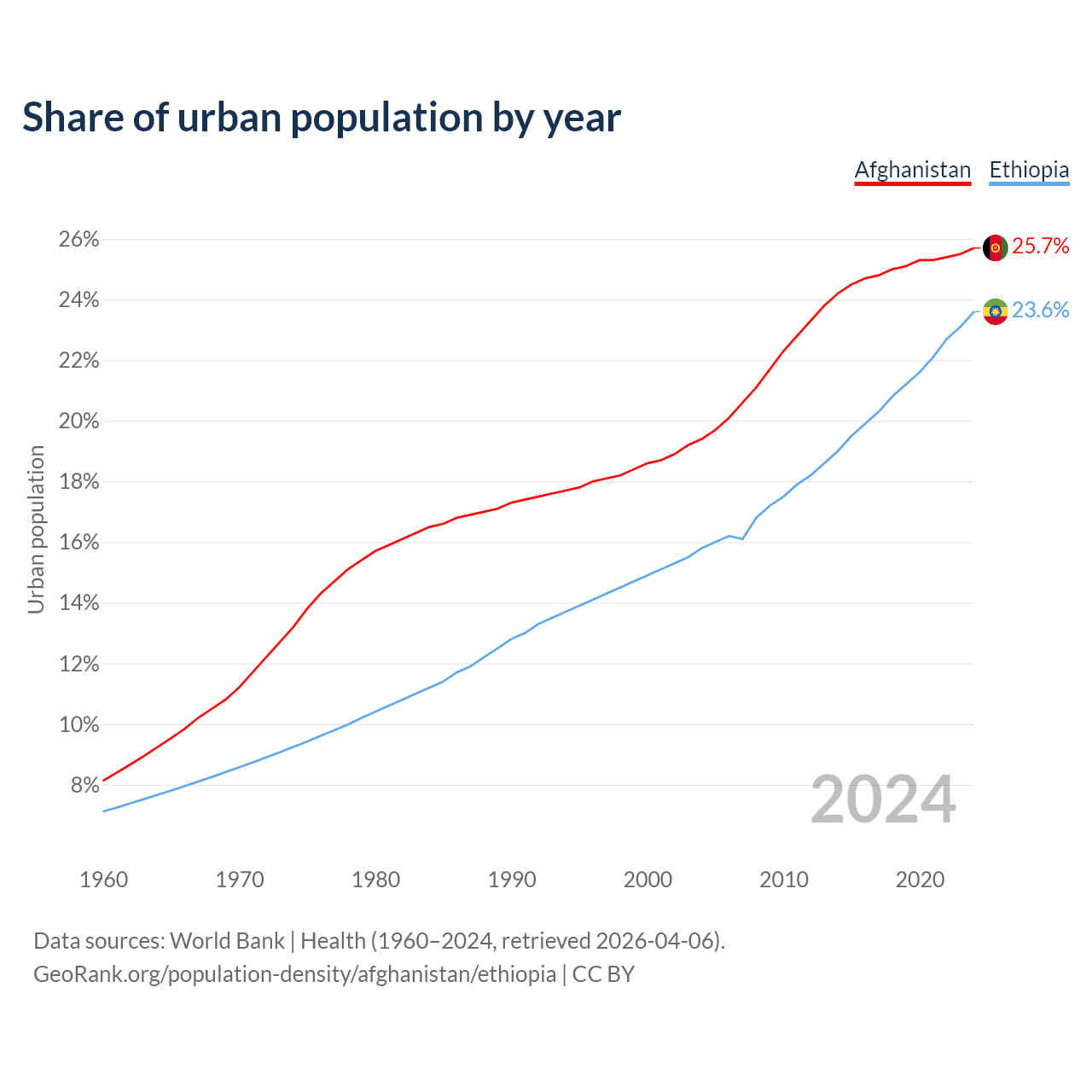 From 2004 to 2024, the share of urban population changed from 19.4% to 25.7% in Afghanistan and from 15.8% to 23.6% in Ethiopia.