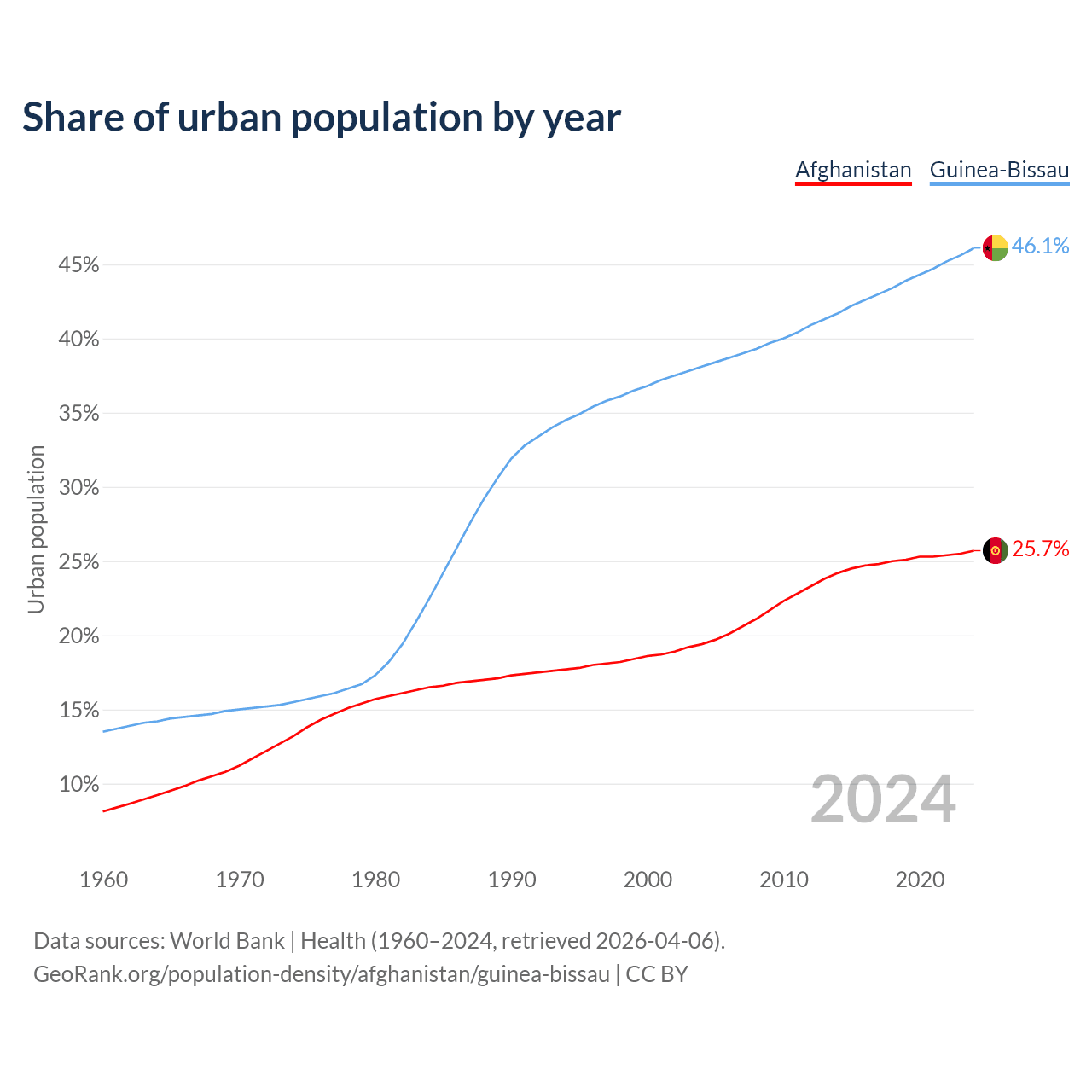 From 2004 to 2024, the share of urban population changed from 19.4% to 25.7% in Afghanistan and from 38.1% to 46.1% in Guinea-Bissau.