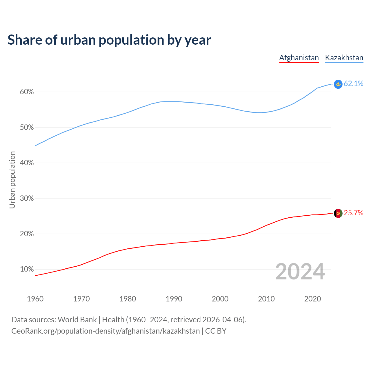 From 2004 to 2024, the share of urban population changed from 19.4% to 25.7% in Afghanistan and from 54.9% to 62.1% in Kazakhstan.