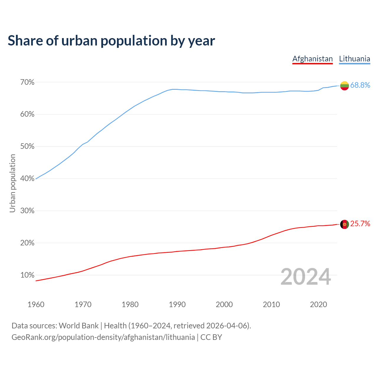 From 2004 to 2024, the share of urban population changed from 19.4% to 25.7% in Afghanistan and from 66.6% to 68.8% in Lithuania.