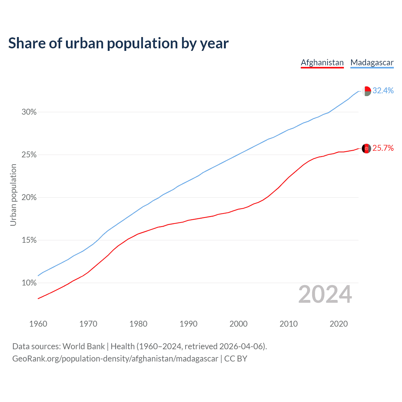 From 2004 to 2024, the share of urban population changed from 19.4% to 25.7% in Afghanistan and from 26.2% to 32.4% in Madagascar.