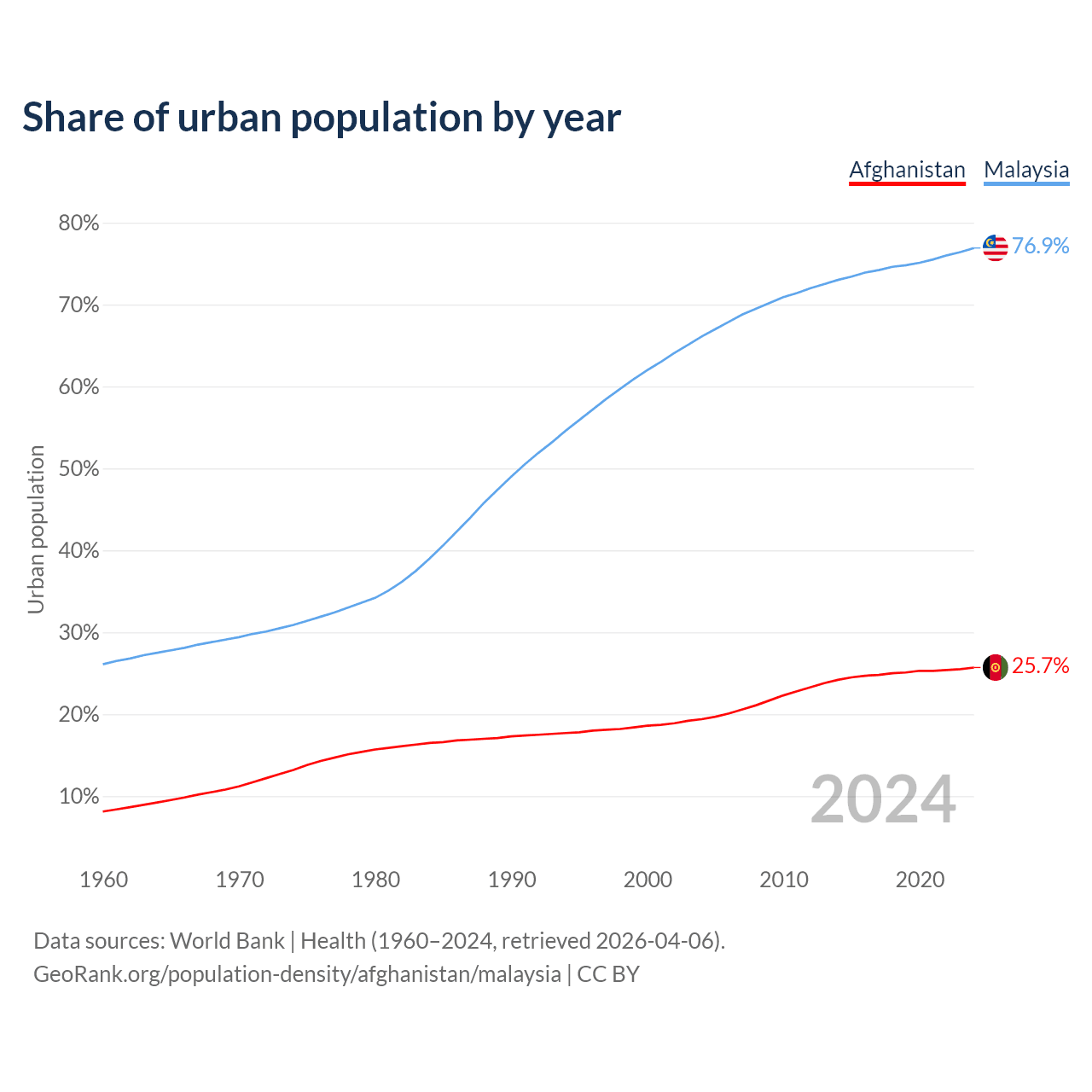 From 2004 to 2024, the share of urban population changed from 19.4% to 25.7% in Afghanistan and from 66.1% to 76.9% in Malaysia.