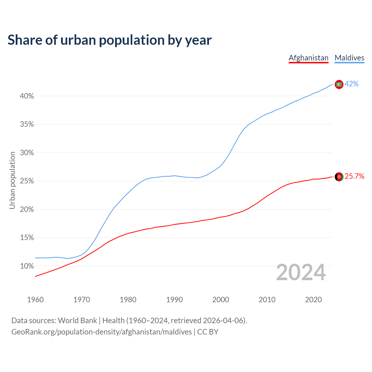From 2004 to 2024, the share of urban population changed from 19.4% to 25.7% in Afghanistan and from 32.9% to 42% in Maldives.
