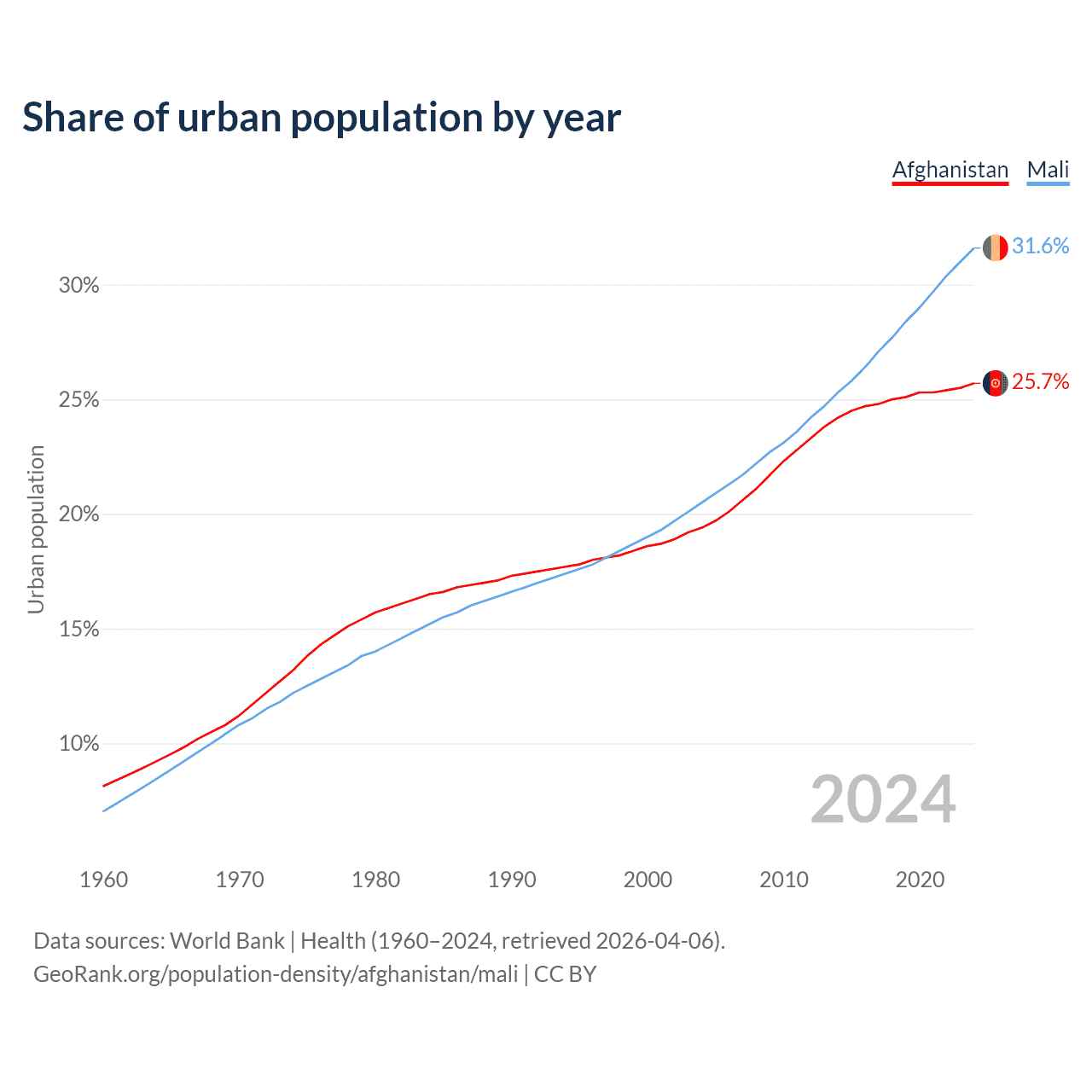 From 2004 to 2024, the share of urban population changed from 19.4% to 25.7% in Afghanistan and from 20.5% to 31.6% in Mali.